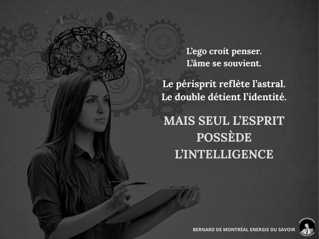L’esprit n’est pas une faculté intellectuelle, mais une force intelligente et une vibration pure qui préexiste à la forme. Durant l’involution, l’homme a confondu son esprit avec sa personnalité. Le « moi » et le « moi-même » constituent des écrans issus de l’astral qui empêchent la lumière de l’esprit de pénétrer directement la matière. Pour devenir un homme complet, l’individu doit un jour ne plus percevoir de différence entre son esprit et lui-même. Il cesse alors de vivre par procuration à travers les idées ou les mémoires pour vivre directement