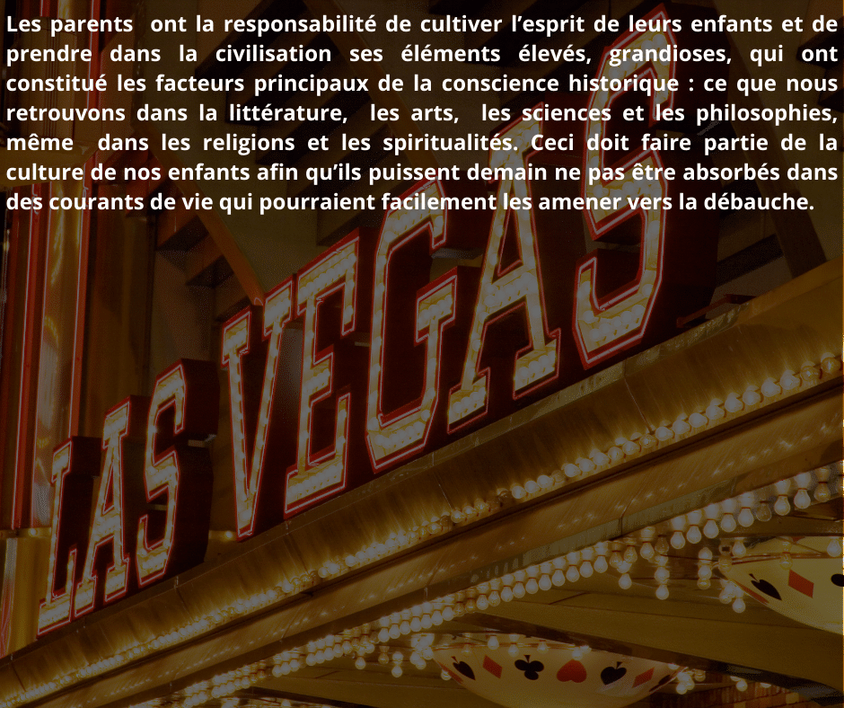 Les parents qui ont des enfants ont la responsabilité de cultiver l’esprit de leurs enfants et de prendre dans la civilisation ses éléments élevés, grandioses, qui ont constitué les facteurs principaux de la conscience historique : ce que nous retrouvons dans la littérature, ce que nous retrouvons dans les arts, ce que nous retrouvons dans les sciences et les philosophies et même ce que nous retrouvons dans les religions et les spiritualités. Tous les aspects de l’esprit que l’Homme a voulu cultiver et que certains ont amené à de très hauts niveaux de développement, ceci doit faire partie de la culture de nos enfants afin qu’ils puissent demain ne pas être absorbés dans des courants de vie qui pourraient facilement les amener vers la débauche. Il est à conseiller aux gens qui sont plus jeunes, aux enfants, de parler de leurs problèmes.
