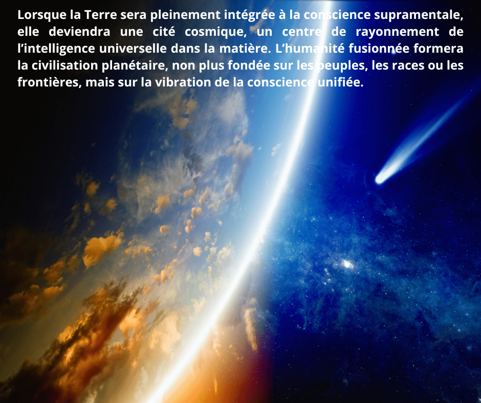 Lorsque la Terre sera pleinement intégrée à la conscience supramentale, elle deviendra une cité cosmique, un centre de rayonnement de l’intelligence universelle dans la matière. L’humanité fusionnée formera la civilisation planétaire, non plus fondée sur les peuples, les races ou les frontières, mais sur la vibration de la conscience unifiée. Ce ne sera plus une civilisation humaine au sens historique, mais une cellule consciente du corps universel de la Vie.