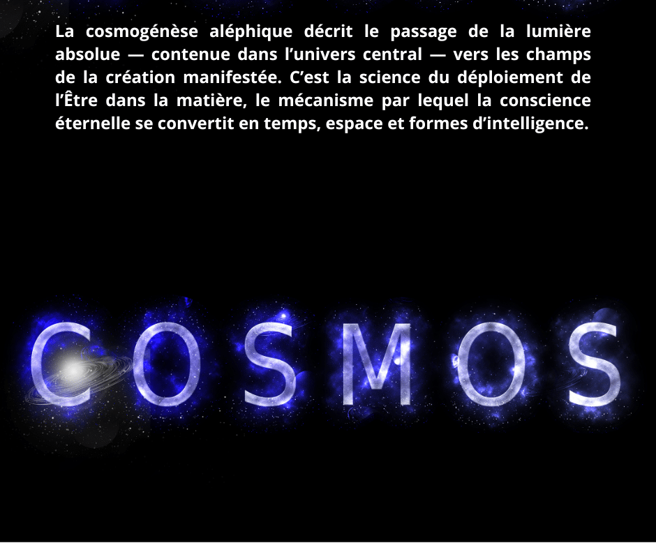 La cosmogénèse aléphique décrit le passage de la lumière absolue — contenue dans l’univers central — vers les champs de la création manifestée. C’est la science du déploiement de l’Être dans la matière, le mécanisme par lequel la conscience éternelle se convertit en temps, espace et formes d’intelligence. L’univers tout entier est le produit de cette descente de feu, une « conversion » progressive de la vibration aléphique en énergie, puis en matière. Chaque degré de cette conversion engendre une hiérarchie de mondes et de consciences.