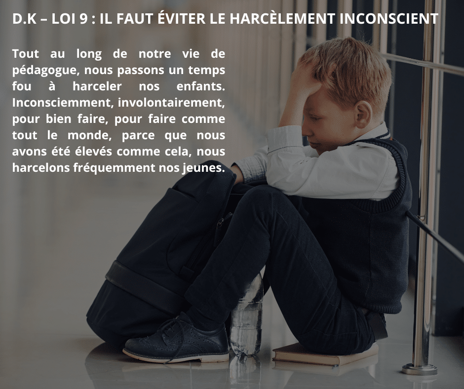 Le harcèlement inconscient peut prendre plusieurs autres formes que celles énoncées. C’est à chacun de nous, pédagogue parent ou pédagogue professionnel, de rechercher, dans notre façon de communiquer, ces différentes formes d’expression du harcèlement.