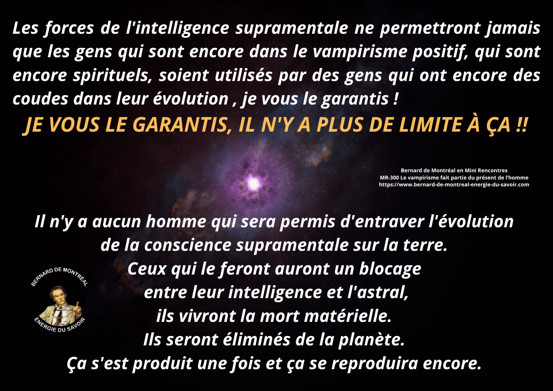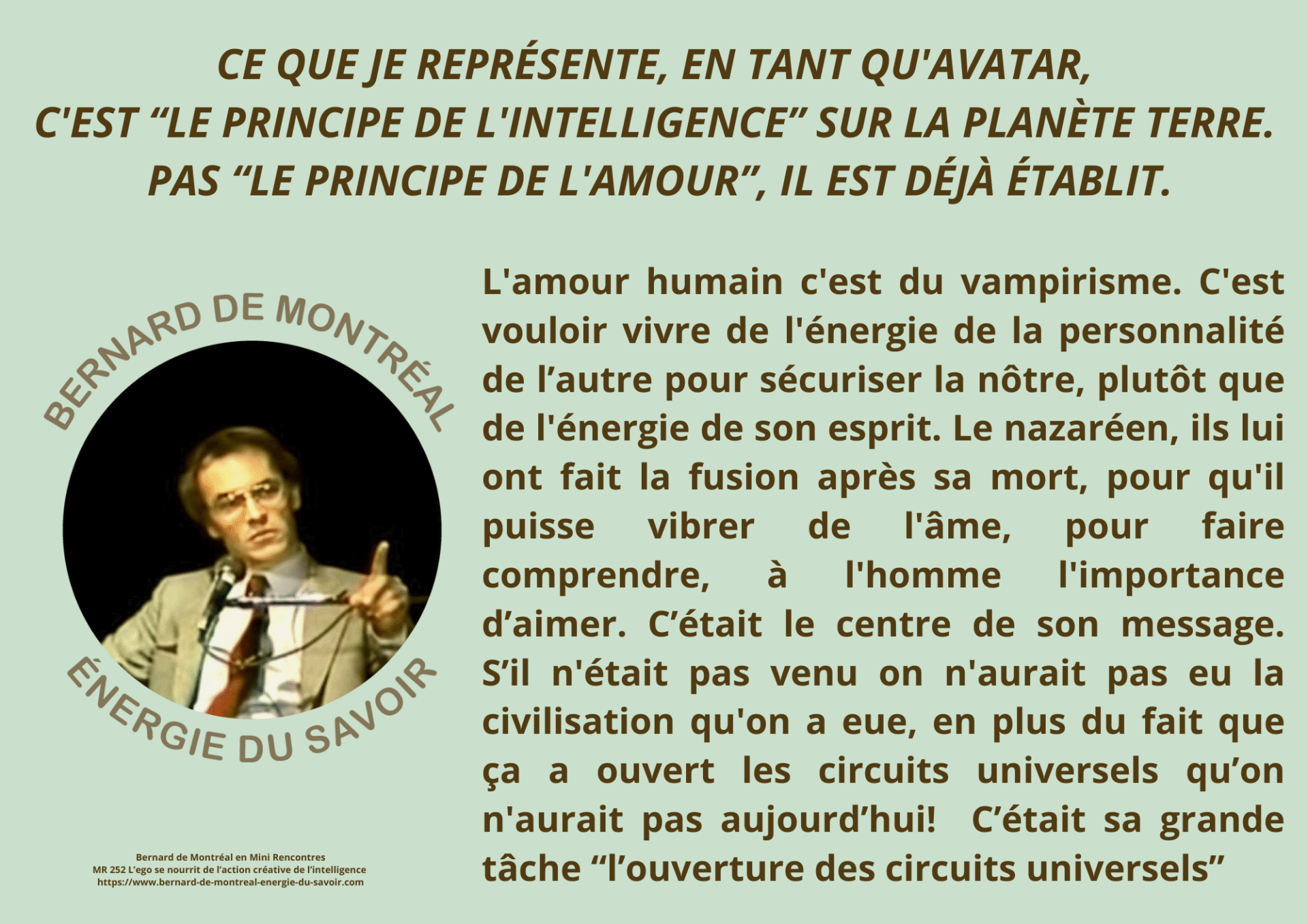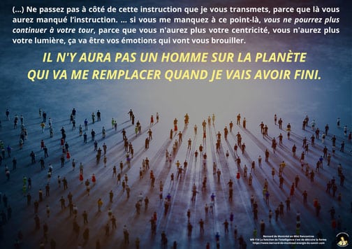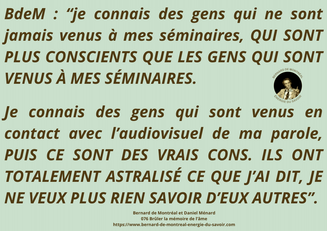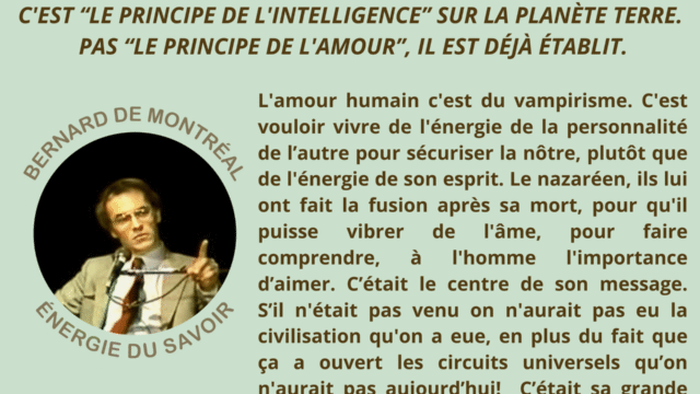 Bernard de Montréal n’est pas présenté comme une figure à vénérer, mais comme le support temporaire d’une intelligence qui dépasse sa personne. L’œuvre ne relève pas d’un héritage psychologique ou culturel ; elle s’inscrit dans une science vivante qui ne peut être transmise que par résonance directe avec l’énergie.