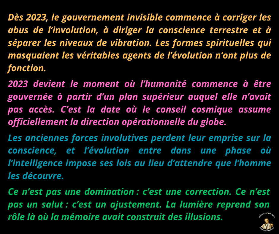 Depuis le changement de plan de Bernard de Montréal, rien n’a été ajouté à l’œuvre dans sa dimension réelle. Tout ce qui circule en parallèle appartient à la répétition, à l’imitation ou à la projection. L’instruction demeure complète, autonome, inaltérable. Elle contient en elle-même les fondements nécessaires pour traverser les cycles à venir.