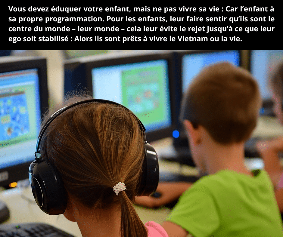 Pour les enfants, leur faire sentir qu’ils sont le centre du monde – leur monde – cela leur évite le rejet jusqu’à ce que leur ego soit stabilisé : Alors ils sont prêts à vivre le Vietnam ou la vie.