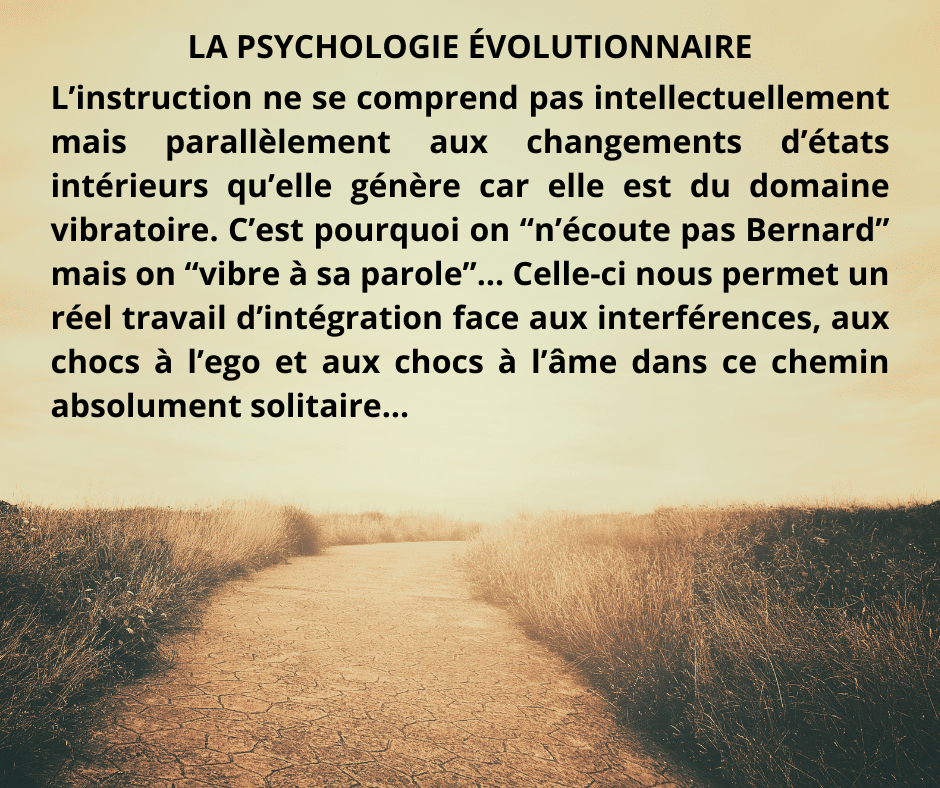 C’est pourquoi on » n’écoute pas » Bernard mais on « vibre » à son instruction… Celle-ci nous permet un réel travail d’intégration face aux interférences, aux chocs à l’ego et aux chocs à l’âme dans ce chemin absolument solitaire…