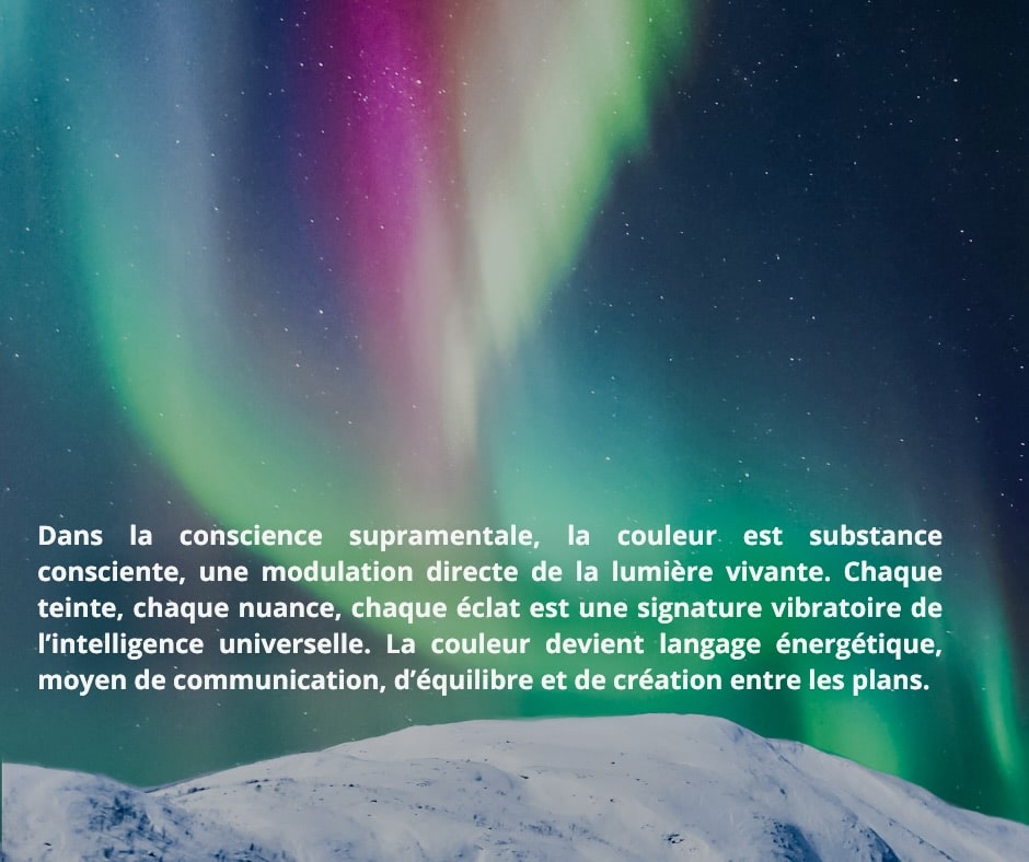Dans la conscience supramentale, la couleur n’est pas apparence ni sensation visuelle : elle est substance consciente, une modulation directe de la lumière vivante. Chaque teinte, chaque nuance, chaque éclat est une signature vibratoire de l’intelligence universelle.La couleur devient langage énergétique, moyen de communication, d’équilibre et de création entre les plans.