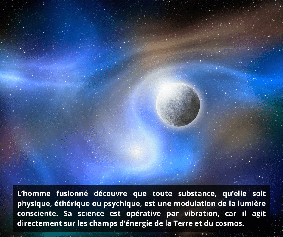 Dans la conscience supramentale, la matière n’est plus perçue comme un objet extérieur à l’homme, mais comme l’extension de son propre champ vibratoire. L’homme fusionné découvre que toute substance, qu’elle soit physique, éthérique ou psychique, est une modulation de la lumière consciente. Sa science n’est donc plus expérimentale ni théorique : elle est opérative par vibration, car il agit directement sur les champs d’énergie de la Terre et du cosmos.