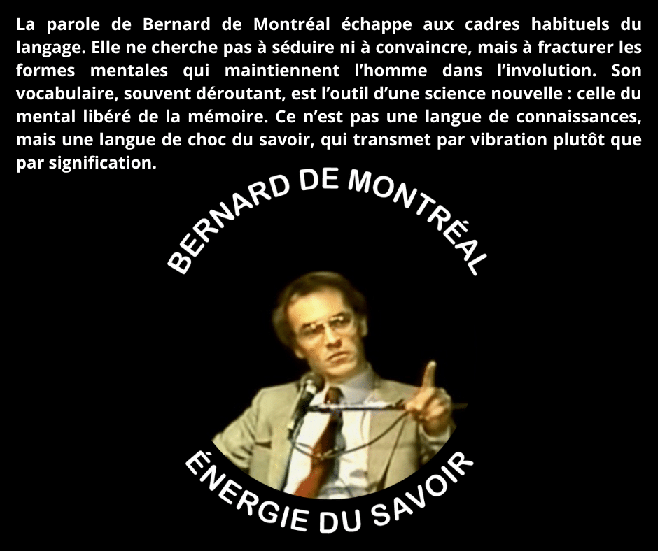 La parole de Bernard de Montréal échappe aux cadres habituels du langage. Elle ne cherche pas à séduire ni à convaincre, mais à fracturer les formes mentales qui maintiennent l’homme dans l’involution. Son vocabulaire, souvent déroutant, est l’outil d’une science nouvelle : celle du mental libéré de la mémoire. Ce n’est pas une langue de connaissances, mais une langue de choc du savoir, qui transmet par vibration plutôt que par signification.