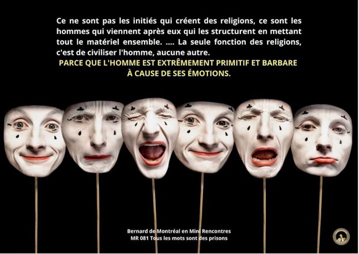 BDM : tous les mots sont des prisons. S’il y a une religion qui grandit, c’est évident que, pour aller chercher des adeptes, on va donner aux mots une valeur particulière qui va attacher les adeptes au centre magnétique de cette religion-là. Alors la chrétienté a fait tout ça, le bouddhisme fait à sa façon, les arabes font à leur façon, les témoins de Jehova font de leur façon. Toutes les religions font de leurs façons.