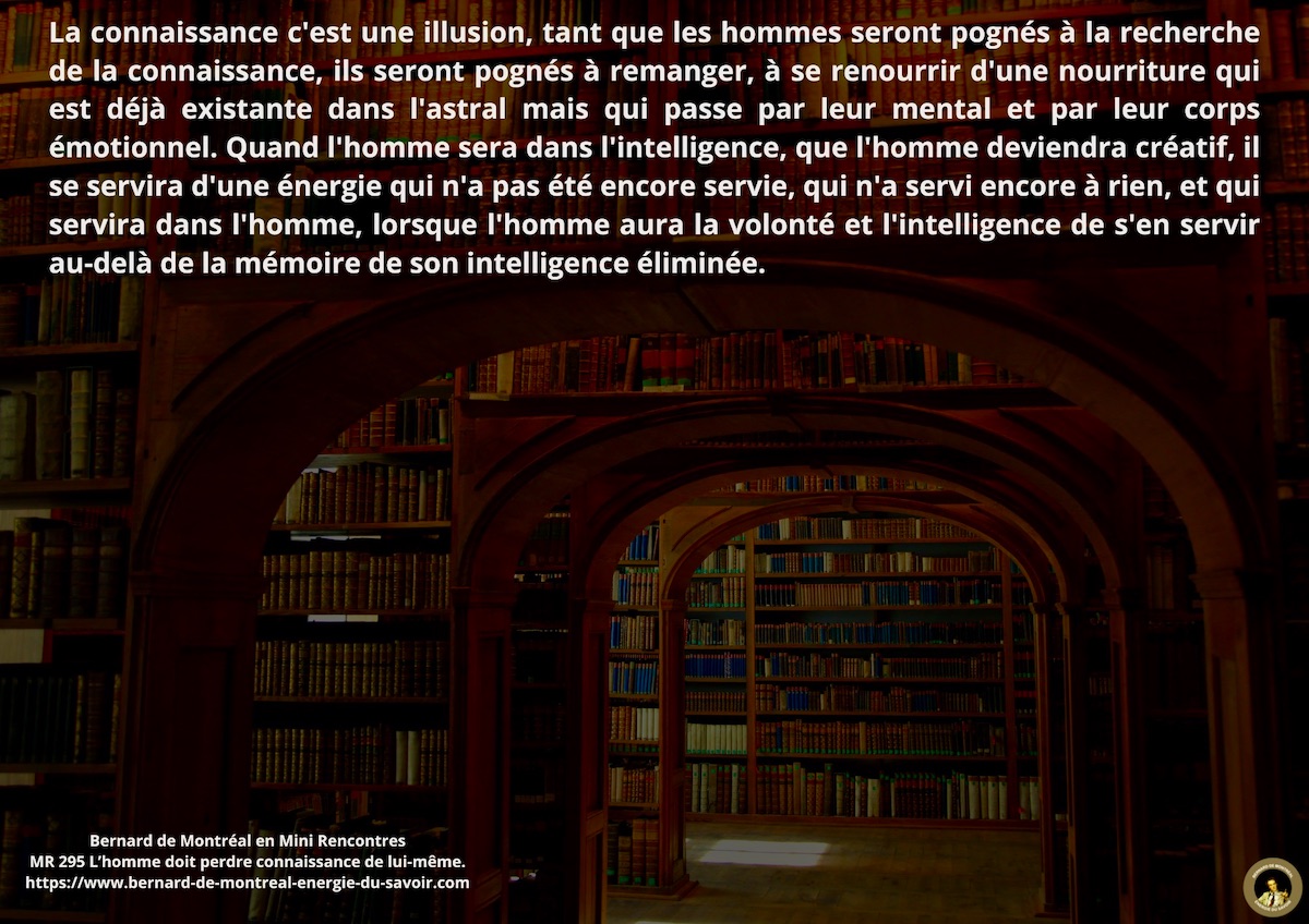 Et perdre connaissance pour l’homme, c’est en arriver à un point dans sa vie où il est tellement éloigné de la mémoire de l’âme qu’il n’a plus l’impression d’être intelligent. Tant que l’homme a l’impression d’être intelligent, il a connaissance de lui-même et si la connaissance de lui-même, il n’est pas en pleine conscience de lui-même et s’il n’est pas en pleine conscience de lui-même, les liens entre le mental, l’émotionnel et le vital et le physique sont trop puissants pour qu’il en arrive à se dématérialiser ou à recomposer les plans de sa vie pour qu’il puisse la vivre sa vie à un autre niveau et selon des lois qui lui sont totalement cachées.