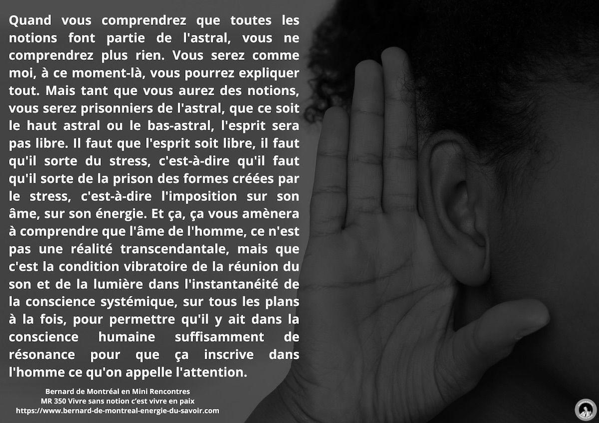 Quand vous comprendrez que toutes les notions font partie de l’astral, vous ne comprendrez plus rien, vous serez comme moi, à ce moment-là vous pourrez tout expliquer. Mais tant que vous aurez des notions vous serez prisonniers de l’astral, que ce soit le haut astral ou le bas astral c’est ça. L’esprit ne sera pas libre. Pour que l’esprit soit libre, il faut qu’il sorte de l’astral, c’est-à-dire qu’il faut qu’il sorte de la prison des formes créées par l’astral, c’est-à-dire l’imposition sur son âme, sur son énergie.