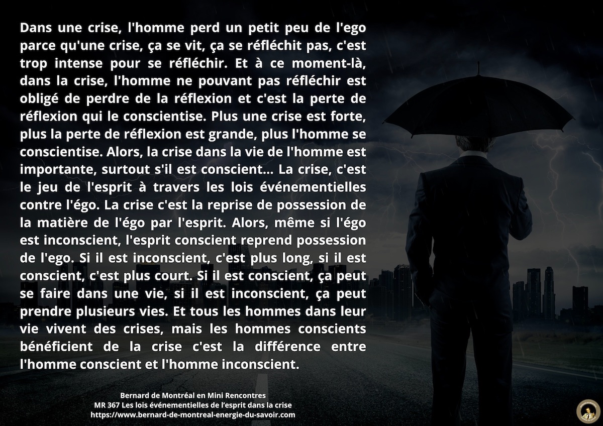 Si il n’en connaît pas les mécanismes, à ce moment-là, l’homme temporairement perd de la réflexion mais, souffrira inconsciemment de sa crise et éventuellement reviendra à l’inconscience mais altéré dans sa personnalité. Tandis que quand un homme est conscient et vit une crise, il ne revient pas à sa personnalité. Il perd petit à petit de la personnalité pour recouvrir petit à petit, de la personne ou de la personnalité réelle. La crise c’est le jeu de l’esprit à travers les lois événementielles contre l’ego. La crise c’est la prise, c’est la reprise de possession de la matière de l’ego, par l’esprit.