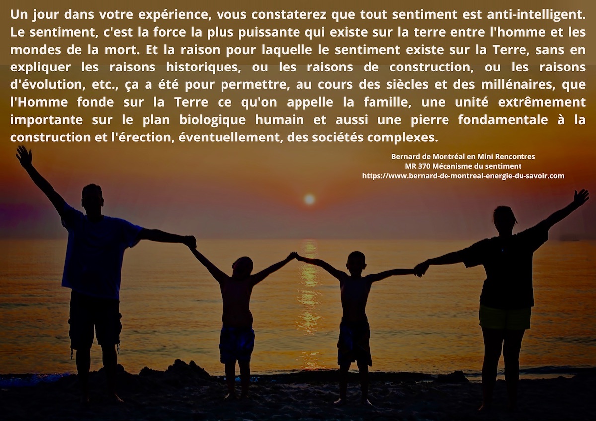 Autrement dit que vous, un jour dans votre expérience, vous constaterez que tout sentiment, tout sentiment est anti-intelligence. Le sentiment c’est la force la plus puissante qui existe sur la Terre entre l’homme et les mondes de la mort. Le sentiment c’est la force la plus puissante sur la Terre qui existe entre les hommes et les mondes de la mort. Et la raison pour laquelle le sentiment existe sur la Terre, sans en expliquer les raisons historiques ou les raisons de construction ou les raisons d’involution ainsi de suite, ça a été pour permettre, au cours des siècles, des millénaires, que l’homme fonde sur la Terre, ce qu’on appelle « la famille ».
