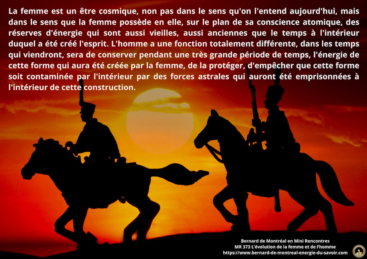 Et à ce moment-là, l’éther terrestre sera libre et ce qui vivra ou ce qui évoluera à l’extérieur de cette éther-là, sera parfait, c’est-à-dire que, il sera parfaitement équilibré et il ne pourra jamais revenir à l’intérieur de cette couche d’énergie qui aura été créée par la femme. La femme est un être cosmique, non pas dans le sens qu’on l’entend aujourd’hui mais dans le sens que la femme possède en elle, sur le plan de sa conscience atomique, des réserves d’énergie qui sont aussi vieilles, aussi anciennes que le temps à l’intérieur duquel a été créé l’esprit.