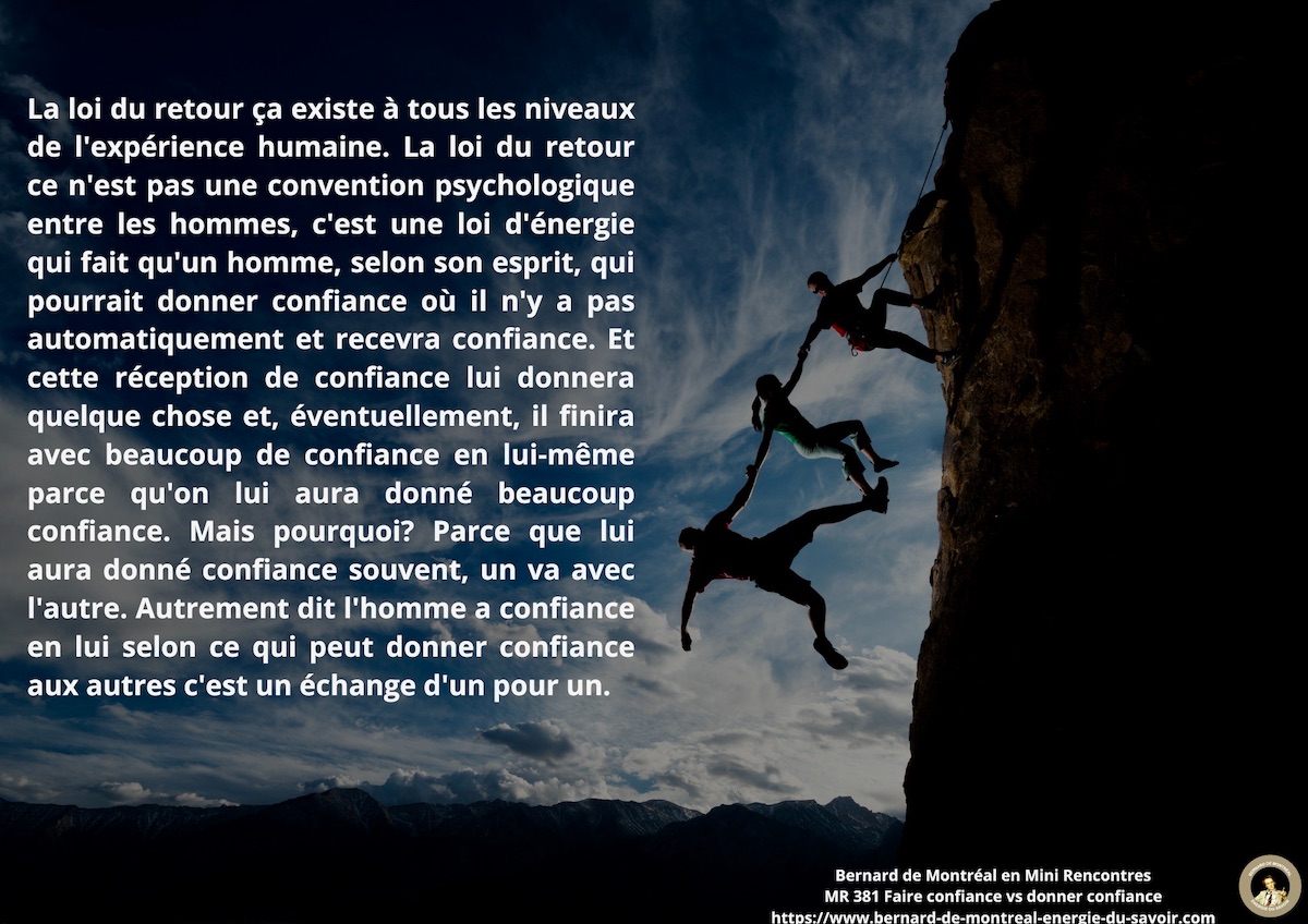 Il y a des gens qui ne sont pas capables de donner confiance. Il y a toujours un petit quelque chose dans leur tête qui reste quand ils donnent confiance. Ils ne donnent jamais confiance à cent pour cent, je parle pas de la confiance aveugle, je parle de la confiance intelligente. Et automatiquement, ils en souffrent et les gens ne leur donnent pas confiance. La loi du retour, vous savez, ça existe à tous les niveaux de l’expérience humaine, la loi du retour. La loi du retour, ce n’est pas une convention psychologique entre les hommes. La loi du retour, c’est une loi d’énergie qui fait que, un homme, selon son esprit, dans le cas présent, par exemple, qui pourrait, donner confiance, automatiquement recevra confiance.