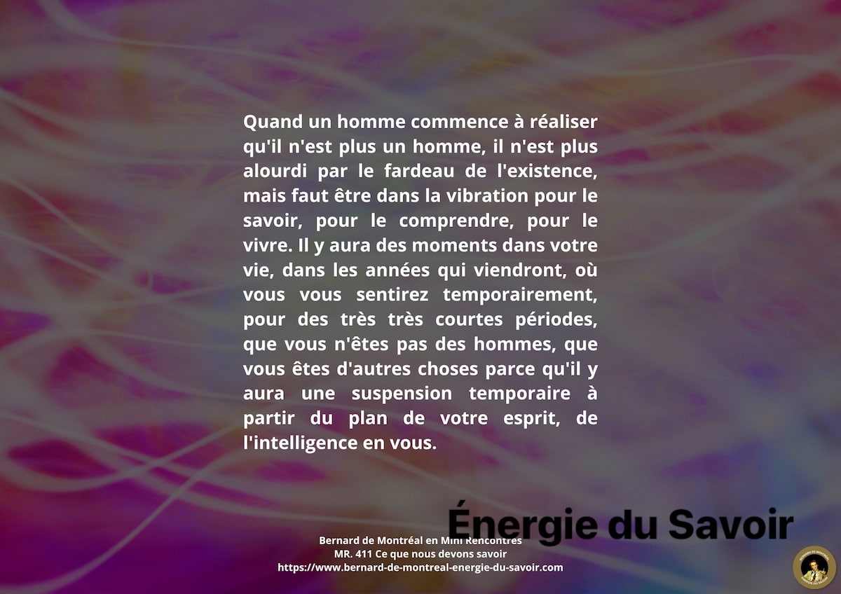 Parce que quand un homme commence à réaliser qu’il n’est plus un homme, il n’est plus alourdi par le fardeau de l’existence. Il est bien. Mais ça, il faut être dans la vibration pour le savoir, pour le comprendre, pour le vivre. Moi je vous le dis, parce que c’est intéressant qu’on le dise mais… il y aura des moments dans votre vie, dans les années qui viendront, où vous sentirez temporairement, pour des très, très courtes périodes, que vous n’êtes pas des hommes, que vous êtes d’autres choses.