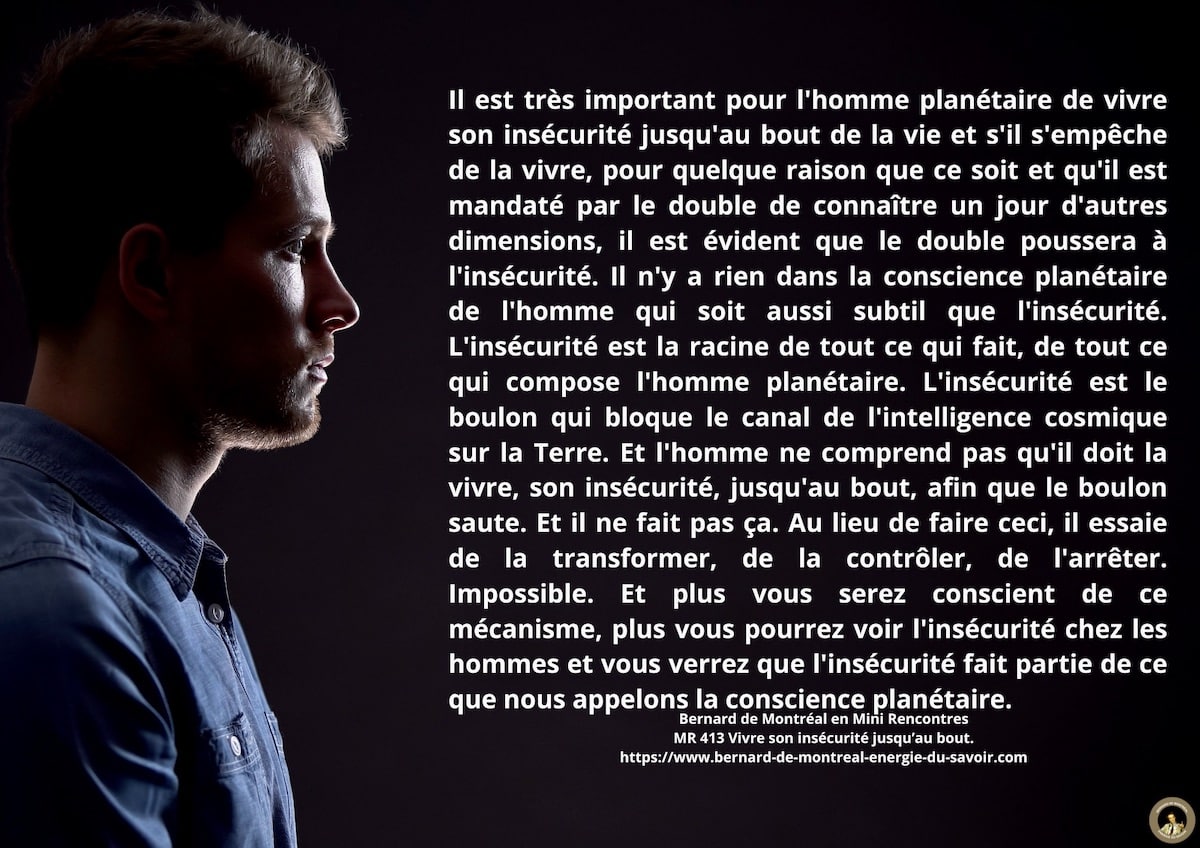 Il peut la déplacer, il peut la transformer, il peut lui donner un autre visage, c’est tout. Mais il ne peut pas l’éliminer. Seul l’homme cosmique peut éliminer l’insécurité dans l’homme planétaire. C’est pourquoi, dans la phénoménalisation de l’homme, réel, de l’homme futur, il est très important pour l’homme planétaire de vivre son insécurité jusqu’au bout, de la vivre. Et s’il s’empêche de la vivre pour quelles que raisons que ce soient et qu’il est mandaté par le double de connaître un jour d’autres dimensions, il est évident que le double poussera à l’insécurité.