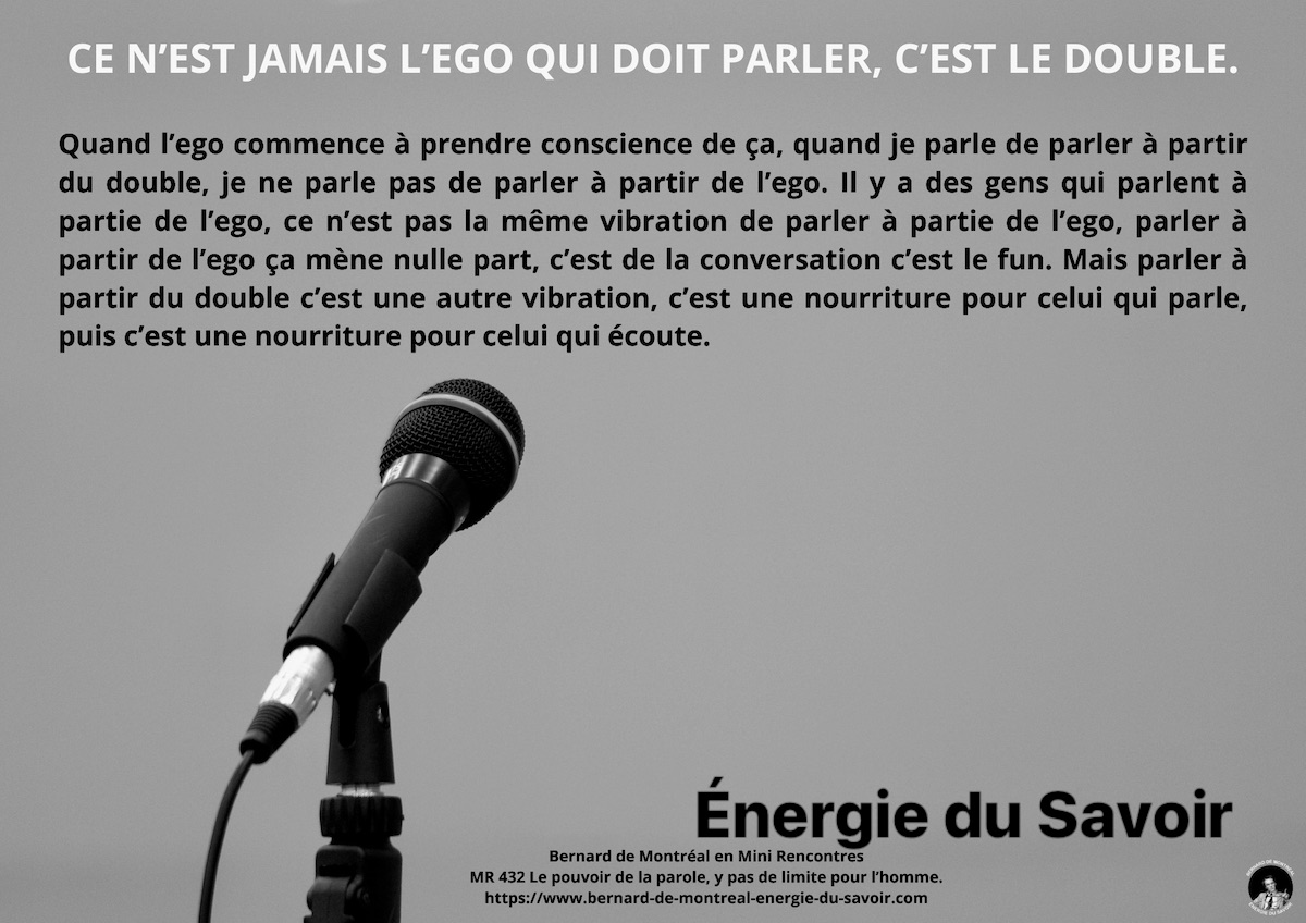 Ça vous apprend à comprendre éventuellement votre avenir, à voir votre avenir, à sentir votre avenir dans le temps du double et non dans le temps de l’ego. Ce n’est jamais l’ego qui doit parler, c’est le double. Quand il arrête l’ego se retire, il se retranche. Quand l’ego commence à prendre conscience de ça, quand je parle de parler à partir du double, je ne parle pas de parler à partir de l’ego. Il y a des gens qui parlent à partir de l’ego, ce n’est pas la même vibration de parler à partir de l’ego. Parler à partir de l’ego ça ne mène nulle part, c’est de la conversation, c’est le fun.