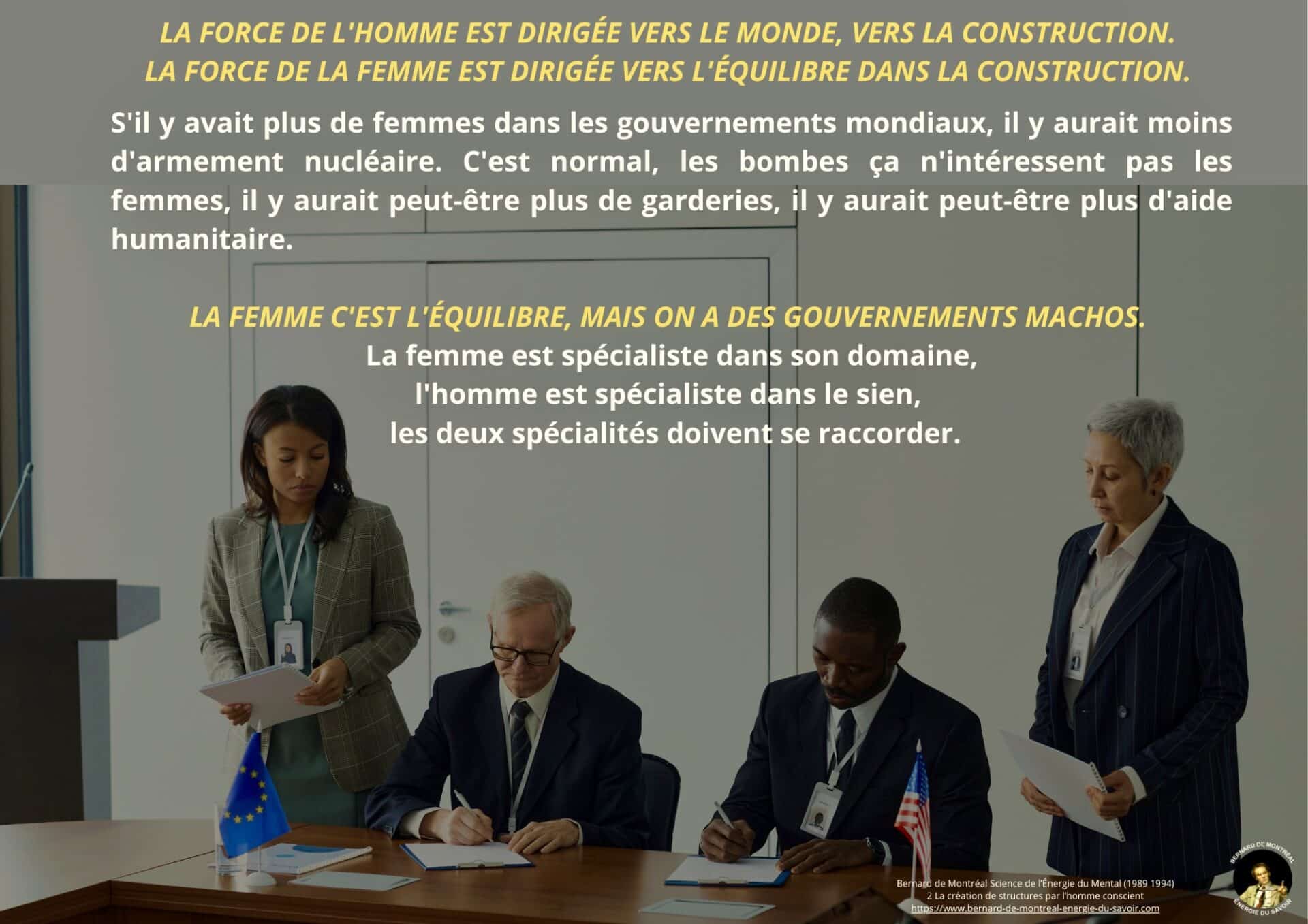 La force de l’homme elle est différente de la force de la femme, parce qu’elle est essentiellement dirigée, différemment. La force de la femme est dirigée… La force de l’homme est dirigée vers le monde, vers la construction. La force de la femme est dirigée vers l’équilibre, dans la construction. S’il y avait plus de femmes dans les gouvernements mondiaux, il y aurait moins d’armement nucléaire. C’est normal. Les bombes ça n’intéressent pas les femmes. Il y aurait peut être plus de garderies. Il y aurait peut être plus d’aide humanitaire. Donc la femme, c’est l’équilibre.