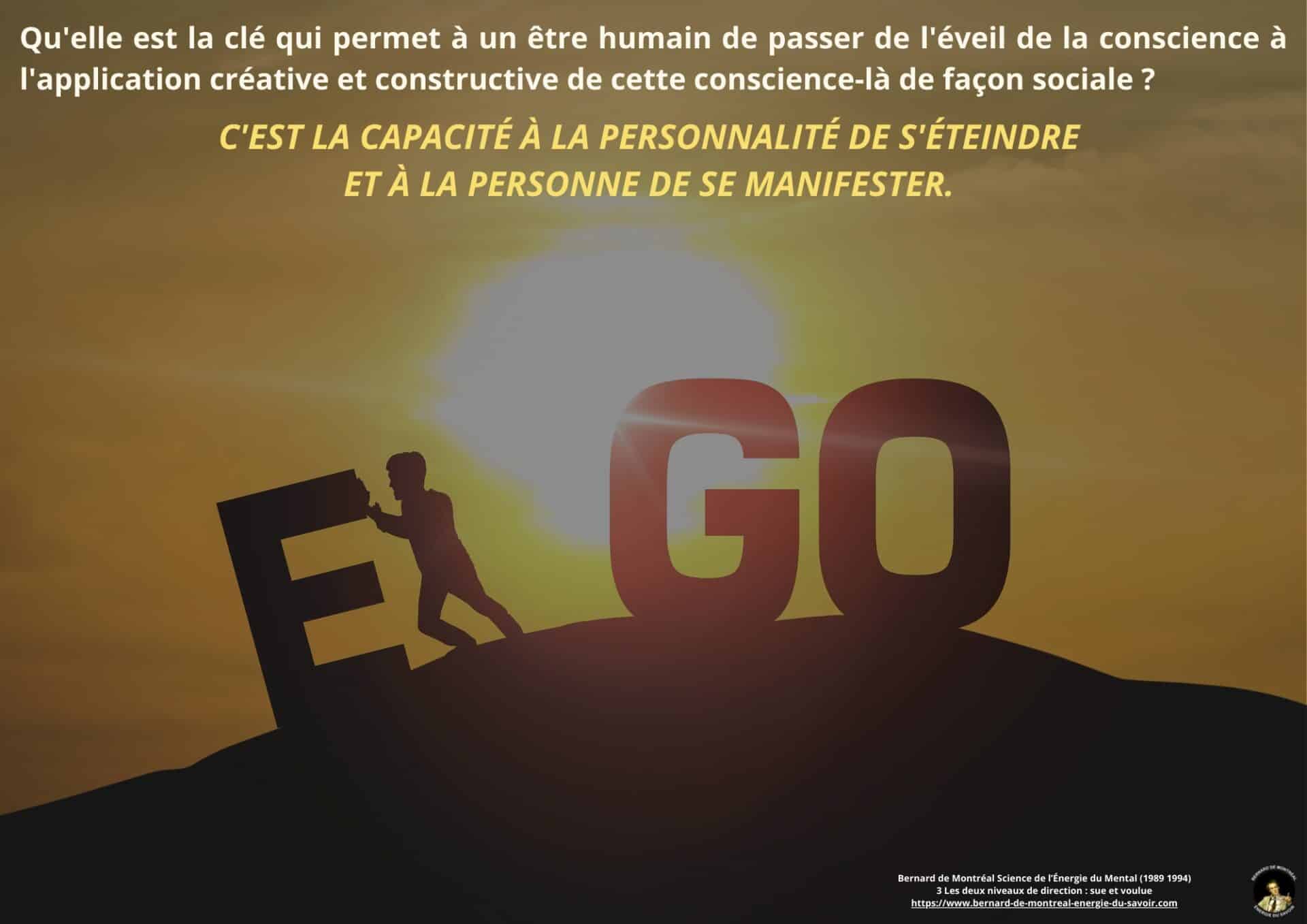 Qu’on est réellement là, qu’on a réellement le vent dans les voiles suffisamment pour sentir que « On l’a fait ! », On l’a fait ! » Quatre vingt douze. Là on est en train de commencer à le faire. Quatre vingt douze, on pourra regarder en arrière puis dire : « Ensemble nous l’avons fait ! ». Qu’est-ce que c’est la clé qui permet à un être humain de passer de l’éveil de la conscience à l’application créative et constructive de cette conscience là de façon sociale ? C’est la capacité à la personnalité de s’éteindre et à la personne de se manifester.