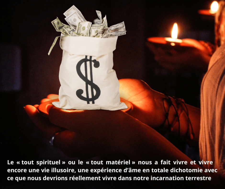 La vision de Bernard atteste que le « tout spirituel » ou le « tout matériel » nous a fait vivre et vivre encore une vie illusoire, une expérience d’âme en totale dichotomie avec ce que nous devrions réellement vivre dans notre incarnation terrestre.