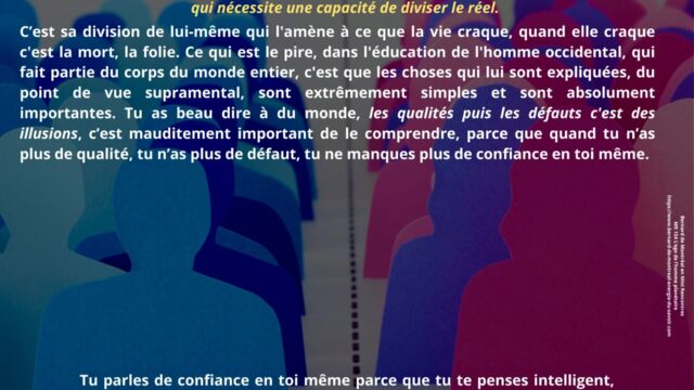 L’insécurité permanente de l’ego planétaire trouve son origine dans la rupture entre le principe cosmique de l’homme et son principe matériel. Déconnecté de sa source intérieure, l’homme ne peut se fier à lui-même. Il cherche alors des appuis extérieurs, qu’il s’agisse de la société, de figures d’autorité, de systèmes idéologiques ou de croyances structurantes.