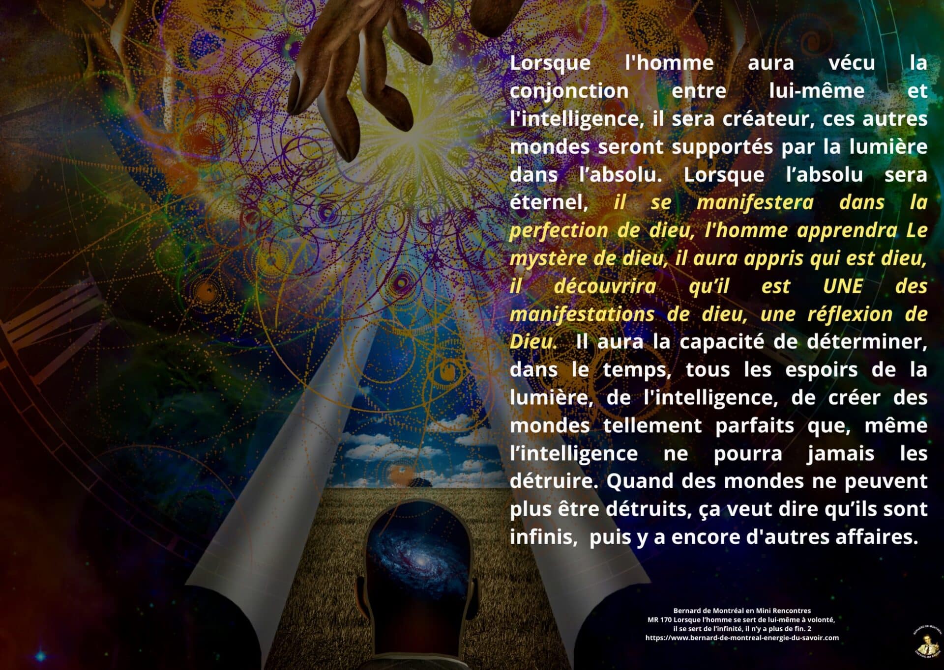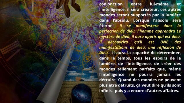 La création est alors abordée sous un angle nouveau. Lorsque l’homme est libéré de ses limites intérieures, il devient capable de participer à la création de mondes durables, dégagés de la répétition et de la finitude. Cette création ne relève pas de l’imaginaire, mais d’une relation directe entre l’intelligence et la matière.