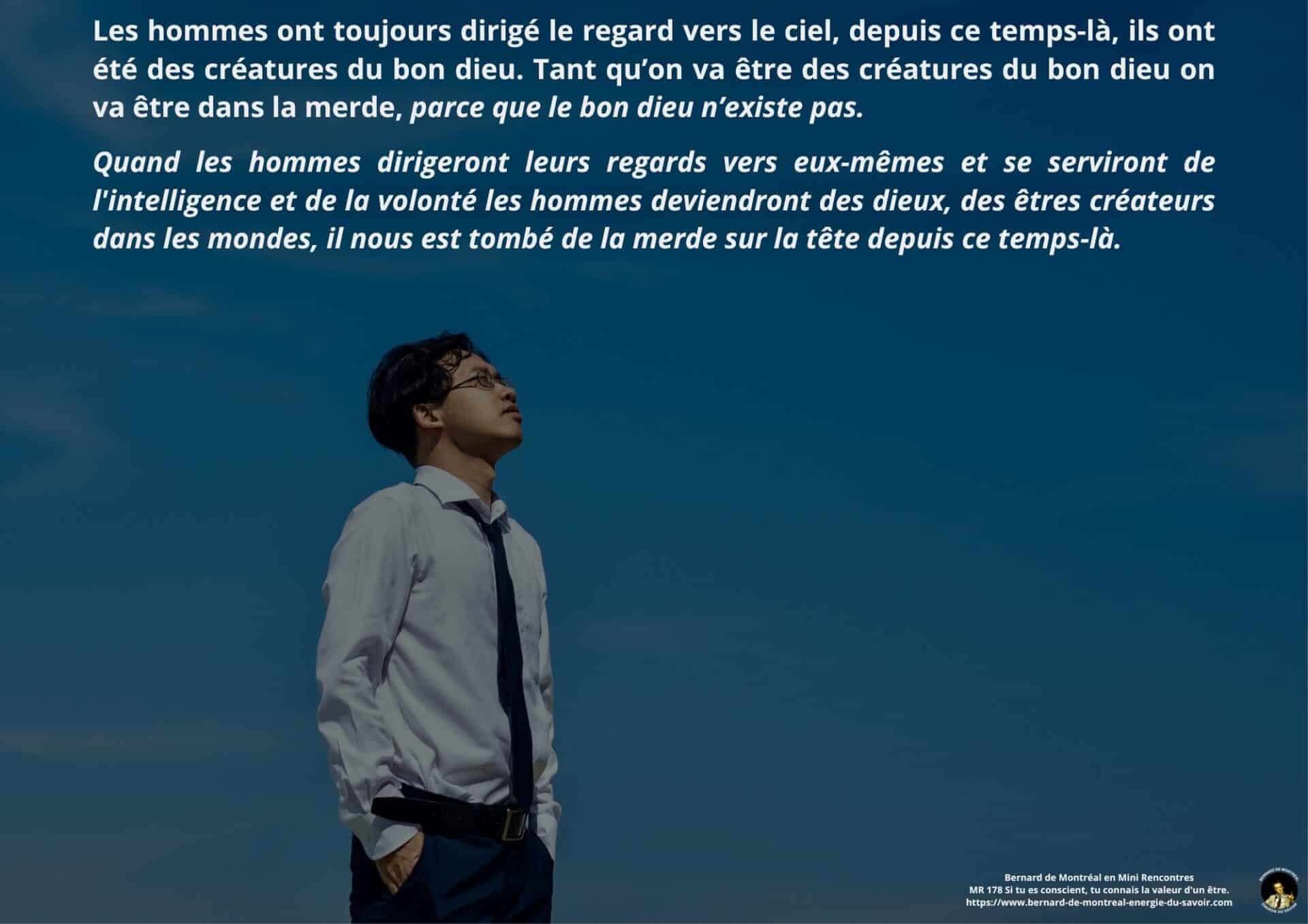 Au fil de l’échange, une critique claire est formulée à l’égard de la tendance humaine à chercher des réponses à l’extérieur de soi. Regarder vers le ciel, se définir comme une créature soumise à une autorité extérieure ou à une figure divine maintient l’homme dans une posture de dépendance et d’impuissance intérieure.