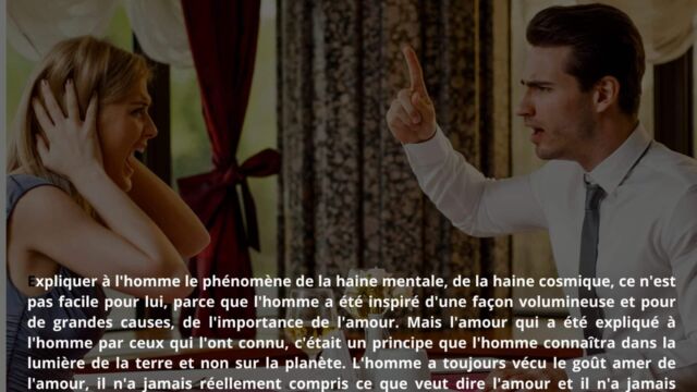 Le thème développé ici introduit la distinction entre la haine humaine et la haine cosmique. La haine humaine relève de la réaction émotionnelle, de la frustration et de la projection affective. Elle affaiblit l’homme et l’enferme dans la répétition. À l’inverse, la haine cosmique ne contient aucune charge émotionnelle. Elle est une force froide, lucide et intelligente.