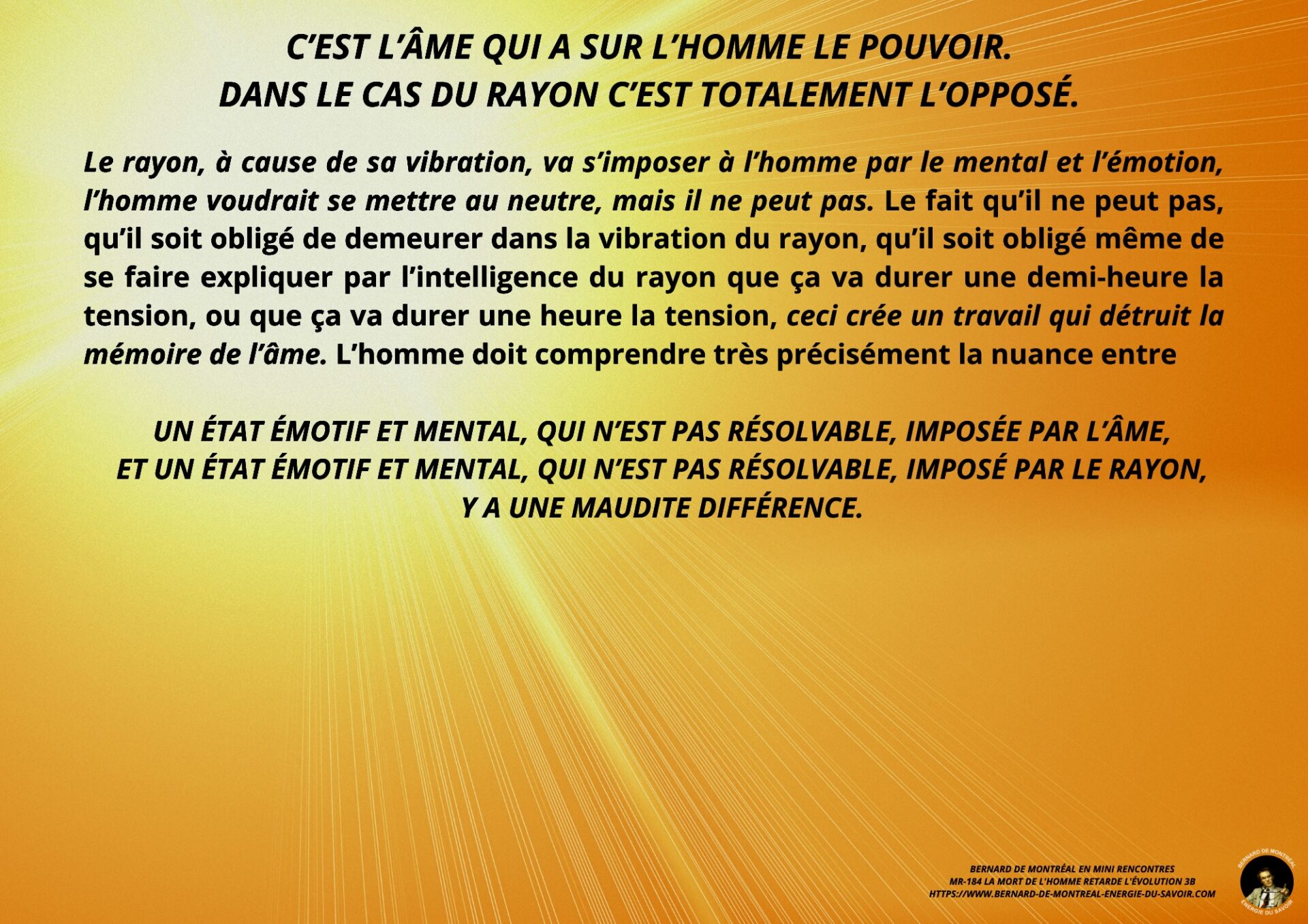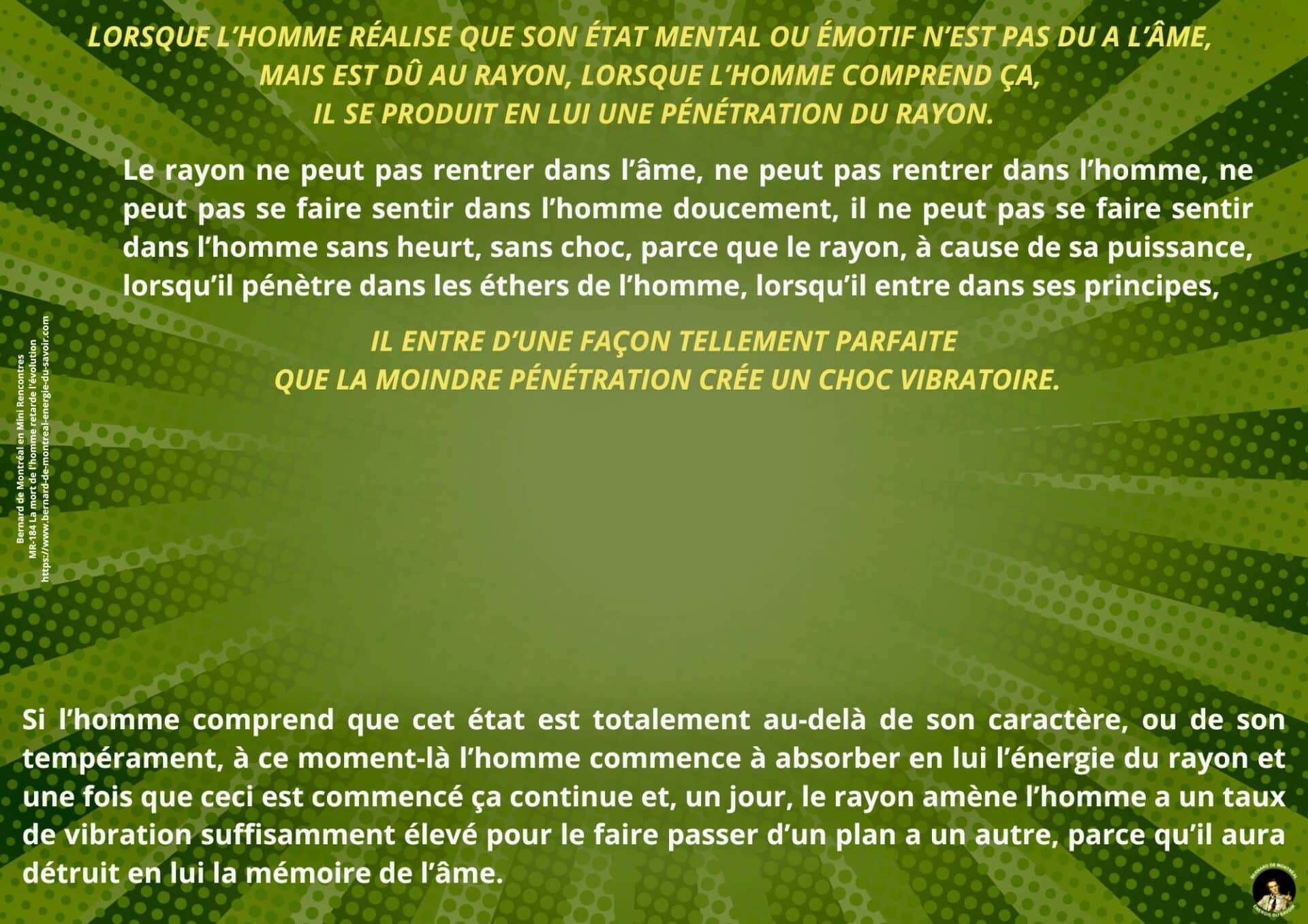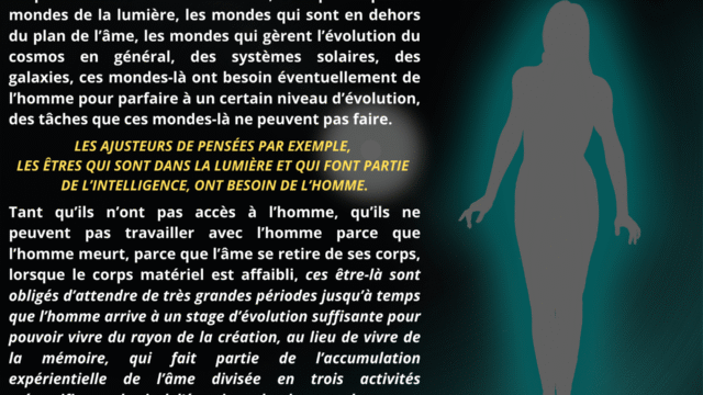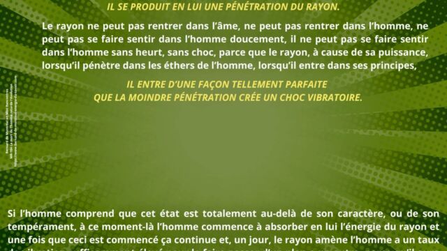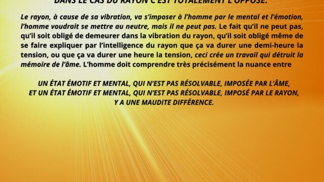 Il est souligné que cette transformation repose sur un changement radical de support intérieur. Vivre à partir de la mémoire de l’âme maintient l’homme dans les contraintes émotionnelles et intellectuelles liées à l’expérience. À l’inverse, vivre de la vibration du rayon permet de sortir de cette dépendance mémorielle et d’entrer dans un registre évolutif différent.