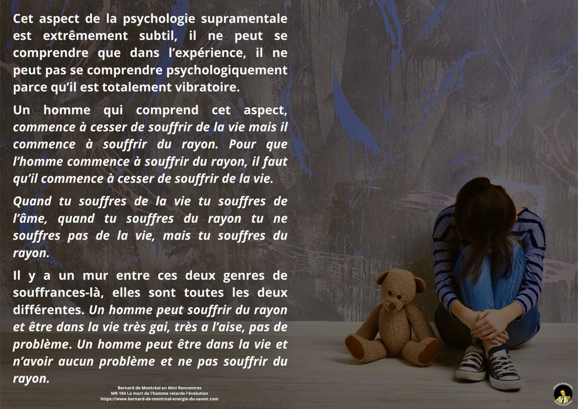 Une distinction est alors établie entre deux formes de souffrance. La souffrance liée à la vie ordinaire appartient à l’âme et à son processus expérimental. La souffrance du rayon, quant à elle, est associée à la transformation de l’être et à son passage vers une continuité de conscience. Elle ne vise pas l’apprentissage par répétition, mais l’intégration directe de l’intelligence.