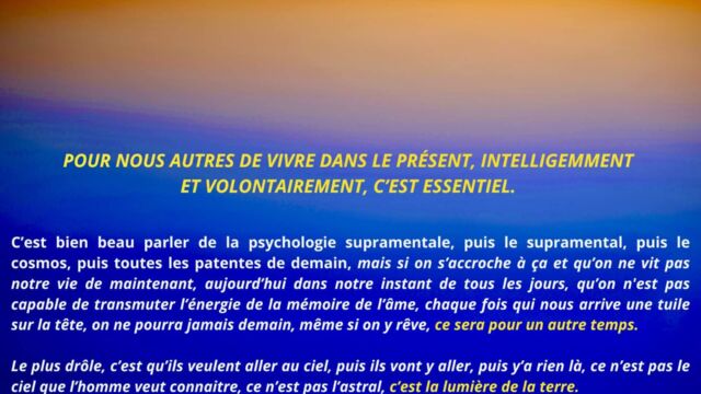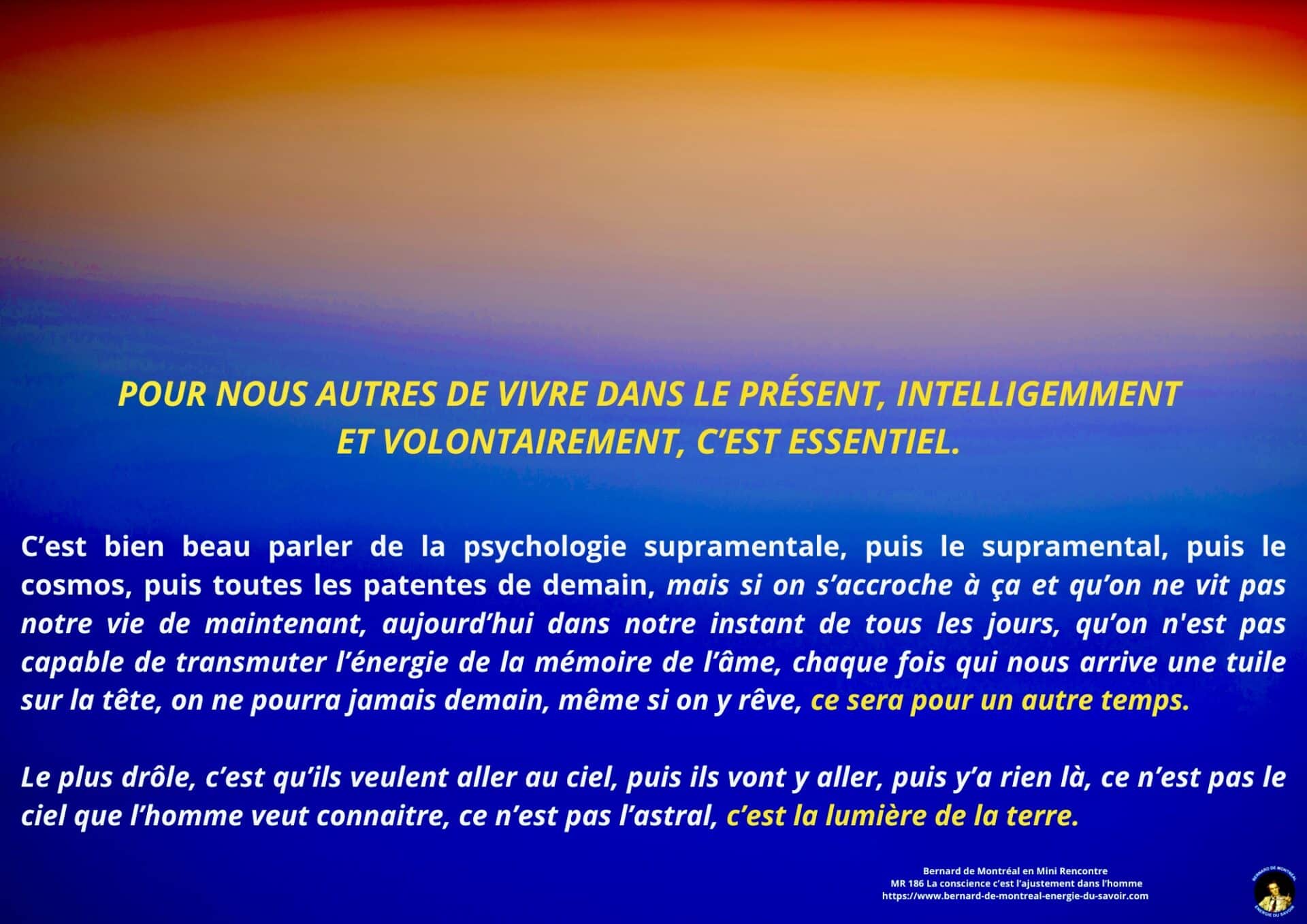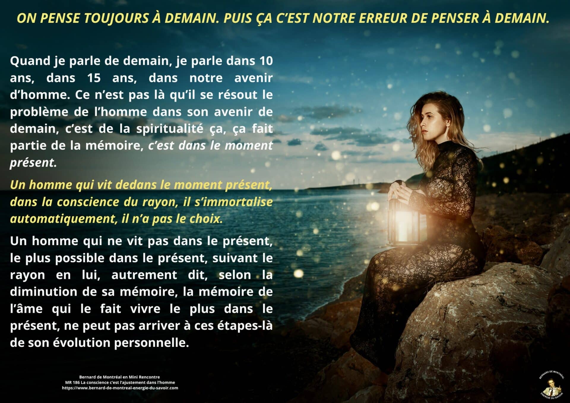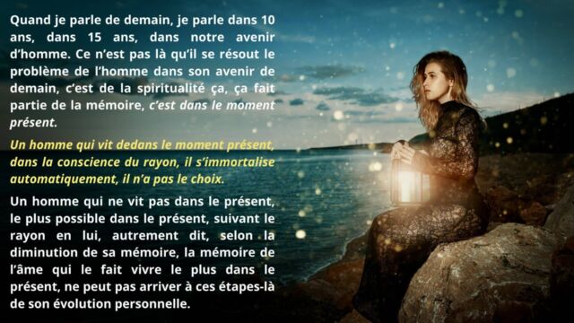 Au fil de l’échange, il est souligné que la projection constante dans l’avenir empêche l’homme de vivre pleinement. Se projeter, anticiper ou espérer détourne la conscience du présent et bloque la réception du rayon, porteur d’intelligence et de volonté. Tant que l’homme n’est pas ancré dans l’instant, l’ajustement ne peut se faire.
