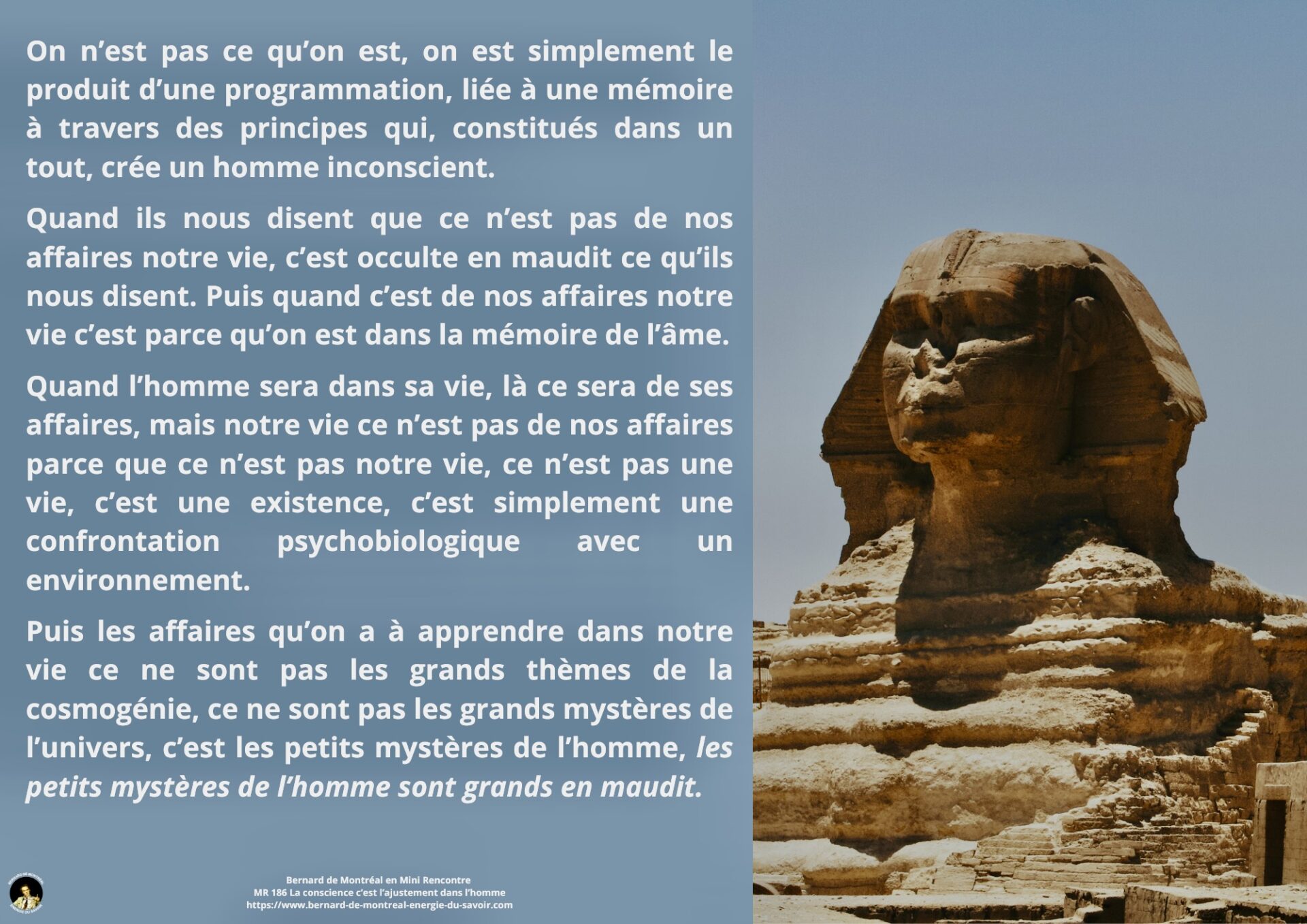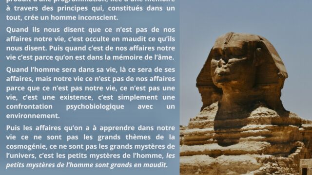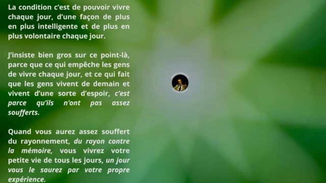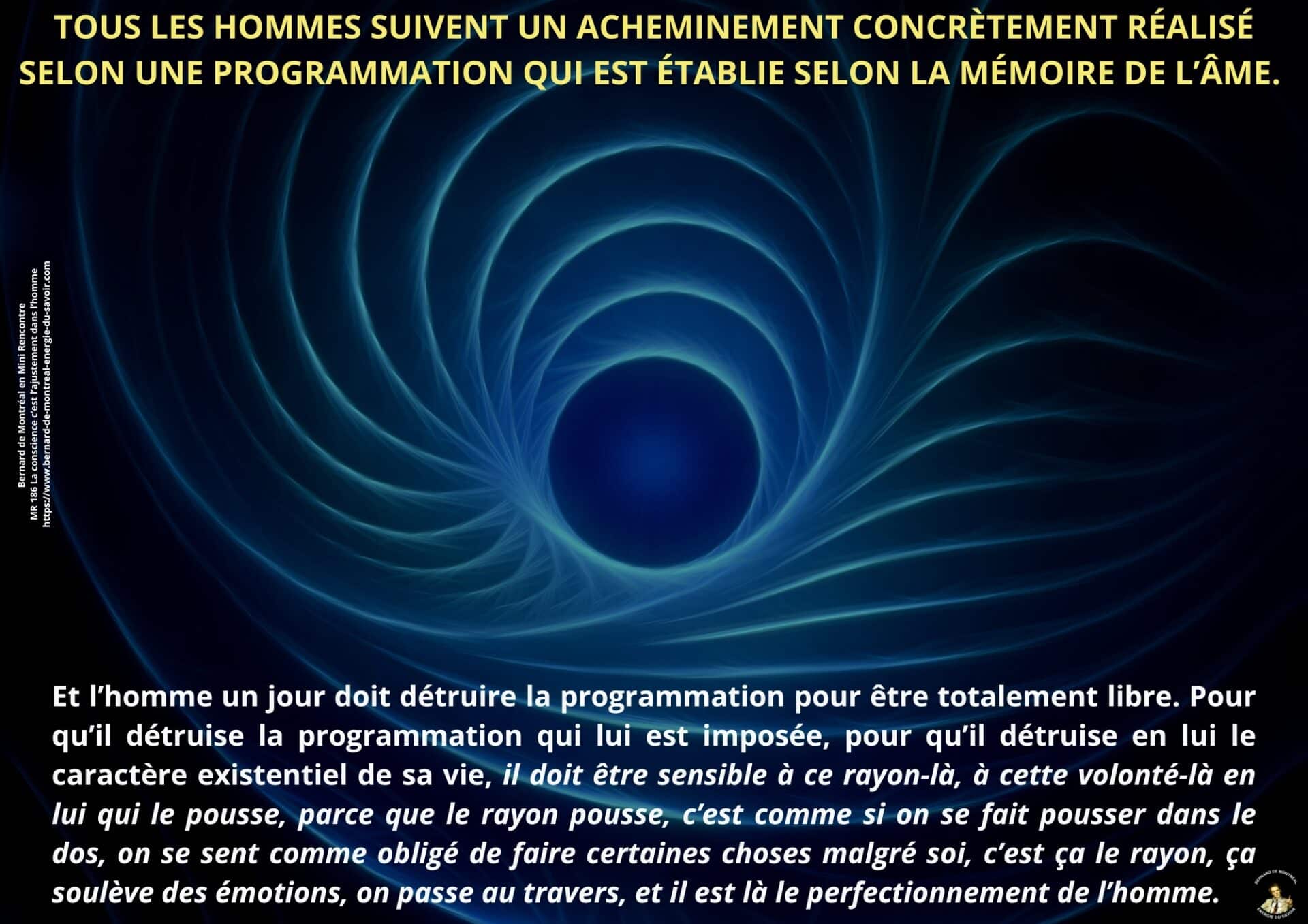 Dans ce passage, la vie humaine ordinaire est décrite comme une existence programmée. Les comportements, les réactions et les aspirations sont largement déterminés par des conditionnements mémoriels. Vivre consciemment implique de sortir de cette programmation et d’agir chaque jour à partir de l’intelligence et de la volonté, plutôt qu’à partir de l’habitude.