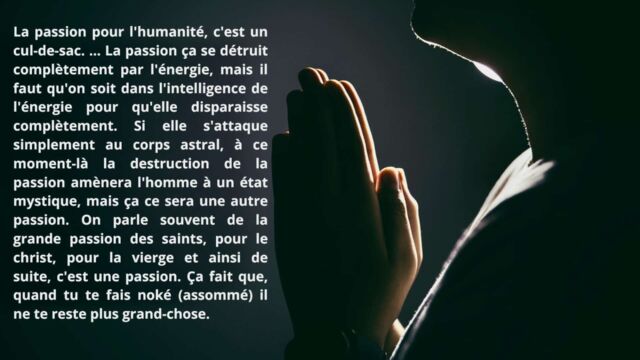 Dans ce passage, la passion est présentée comme un obstacle à la conscience cosmique. Elle entretient une implication émotionnelle qui détourne l’homme de l’intelligence réelle. La passion maintient la conscience dans un registre expérimental et limite l’accès à une stabilité intérieure plus vaste.