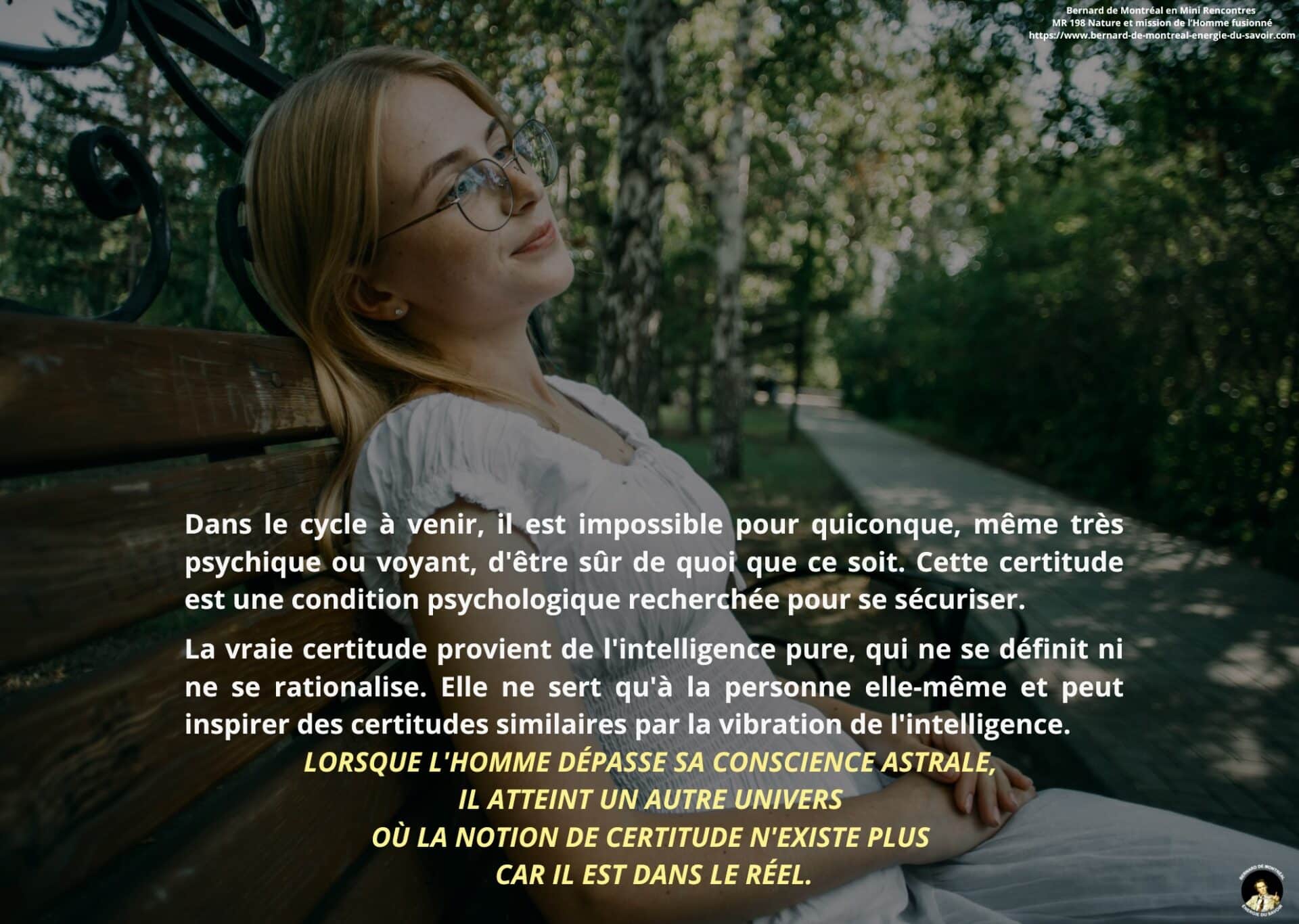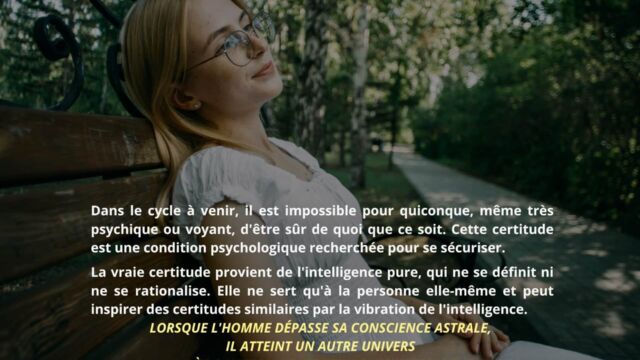 Au fil de l’échange, il est précisé que dans le cycle à venir, l’homme ne peut plus être certain au sens psychologique du terme. La certitude devient une stratégie de sécurité de l’ego. À l’inverse, une autre forme de certitude apparaît, issue de l’intelligence pure. Cette certitude ne se démontre pas, ne s’explique pas et ne sert qu’à celui qui la vit.