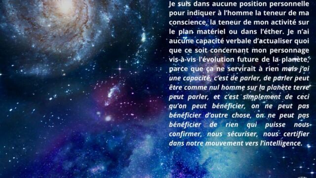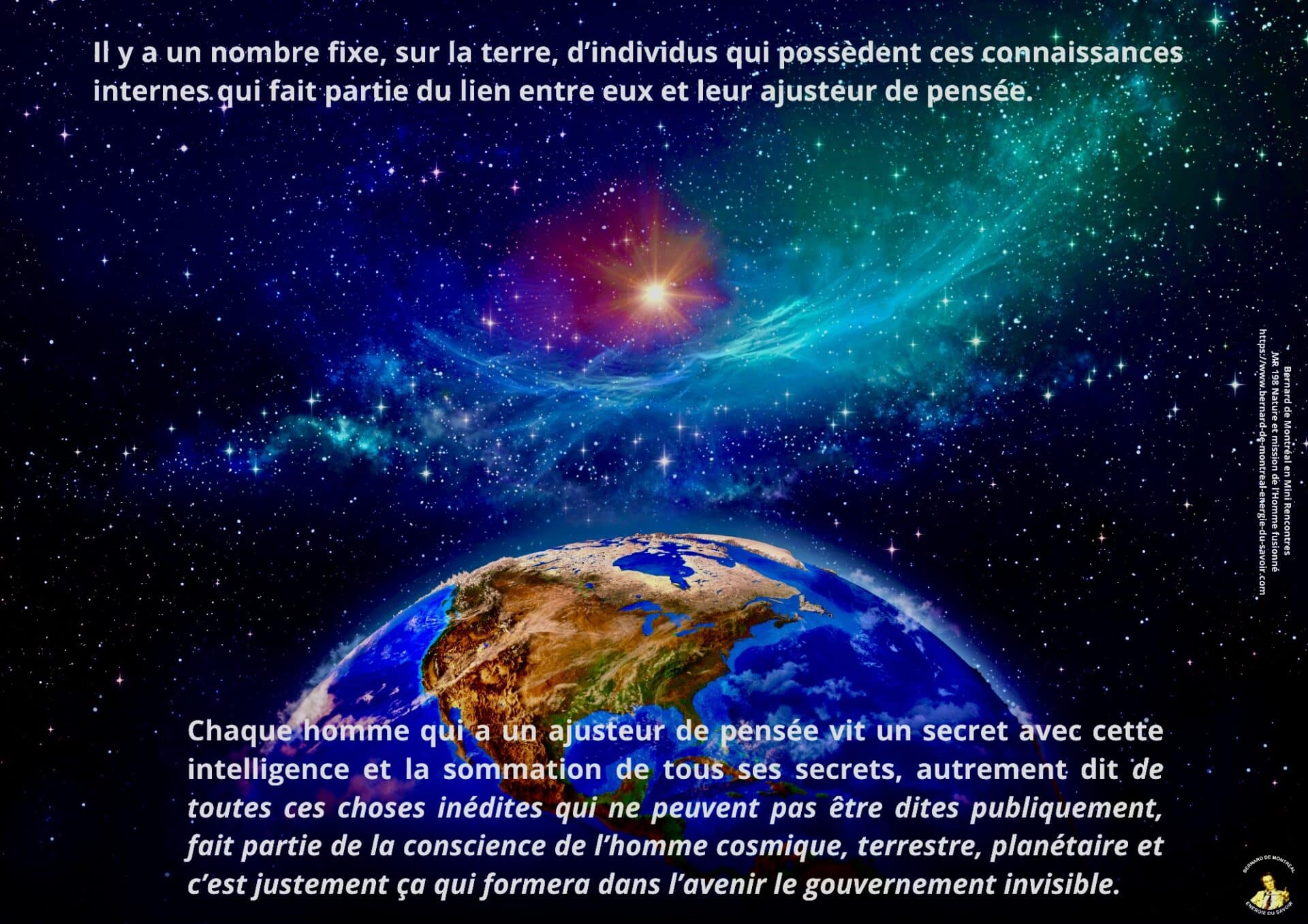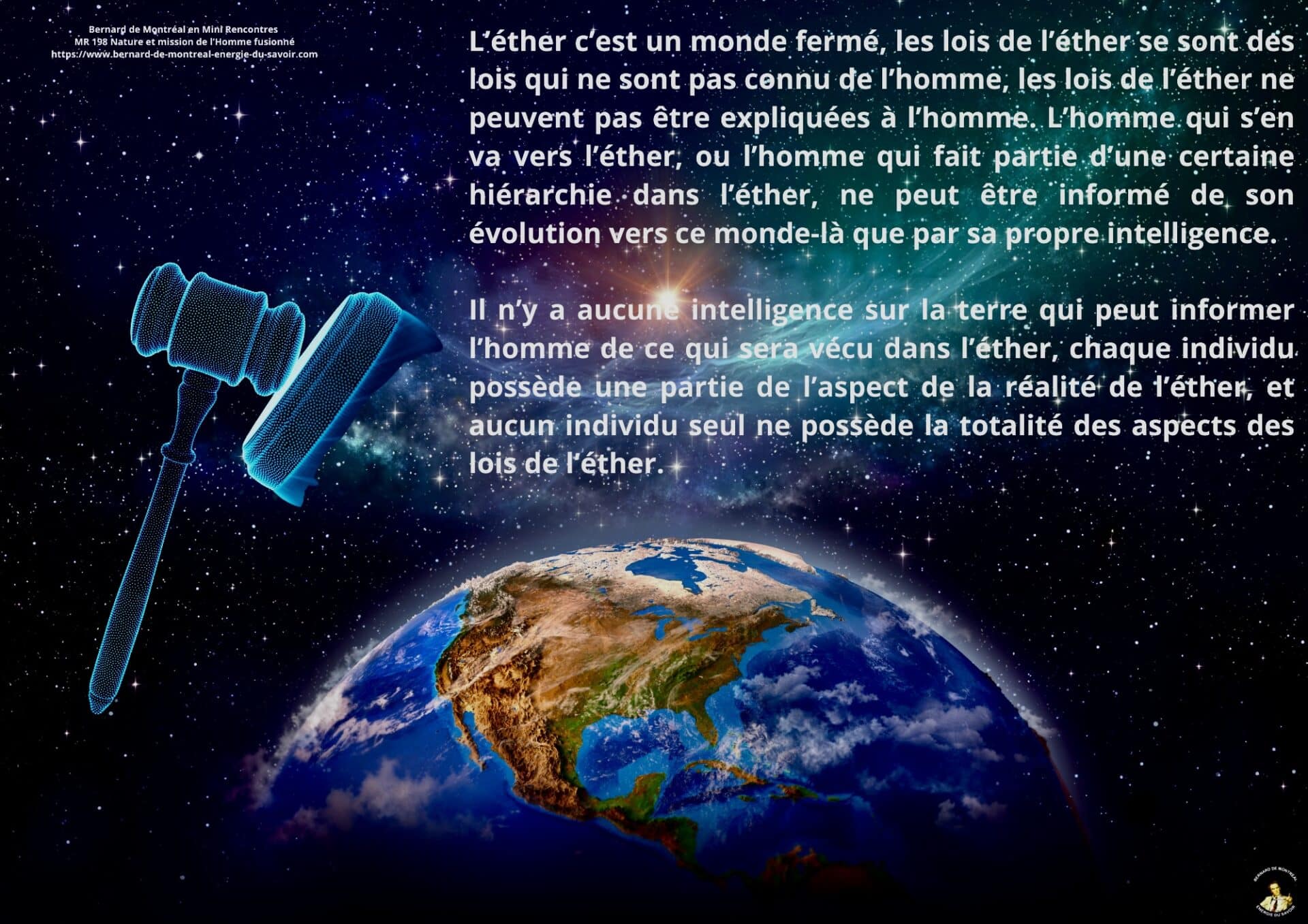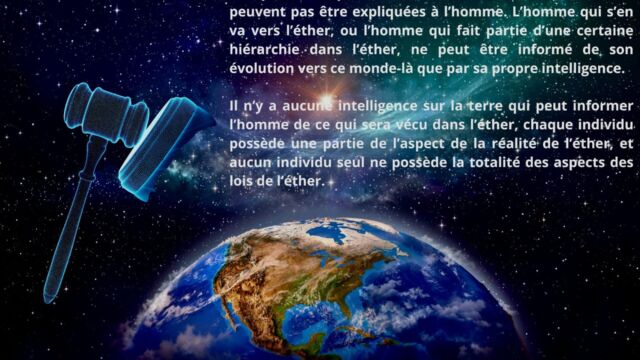 Il est souligné que les lois de l’éther sont inconnues et ne peuvent être enseignées. Chaque individu en perçoit une part spécifique. La somme de ces perceptions forme progressivement la conscience de l’homme cosmique, à la fois terrestre et planétaire.