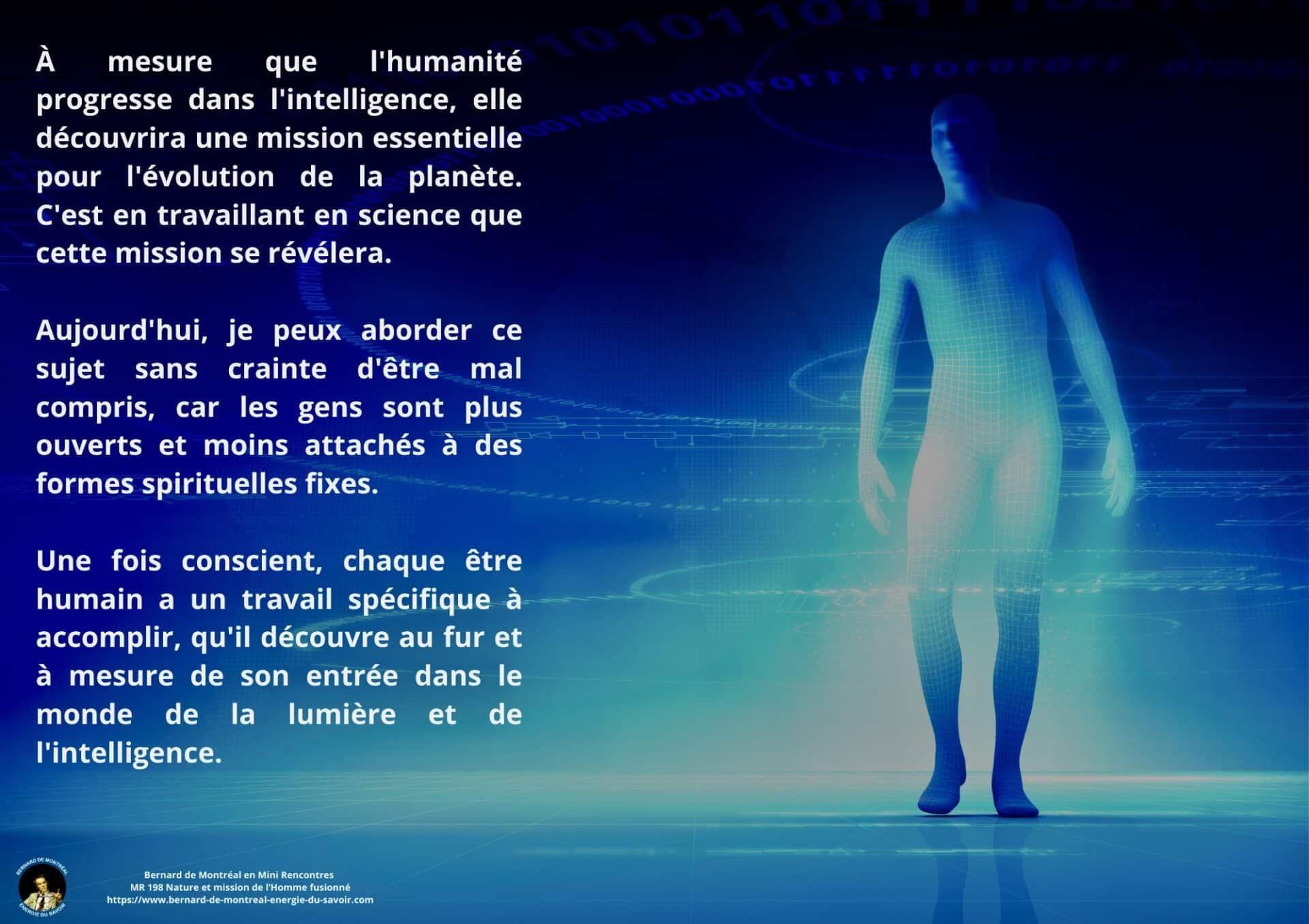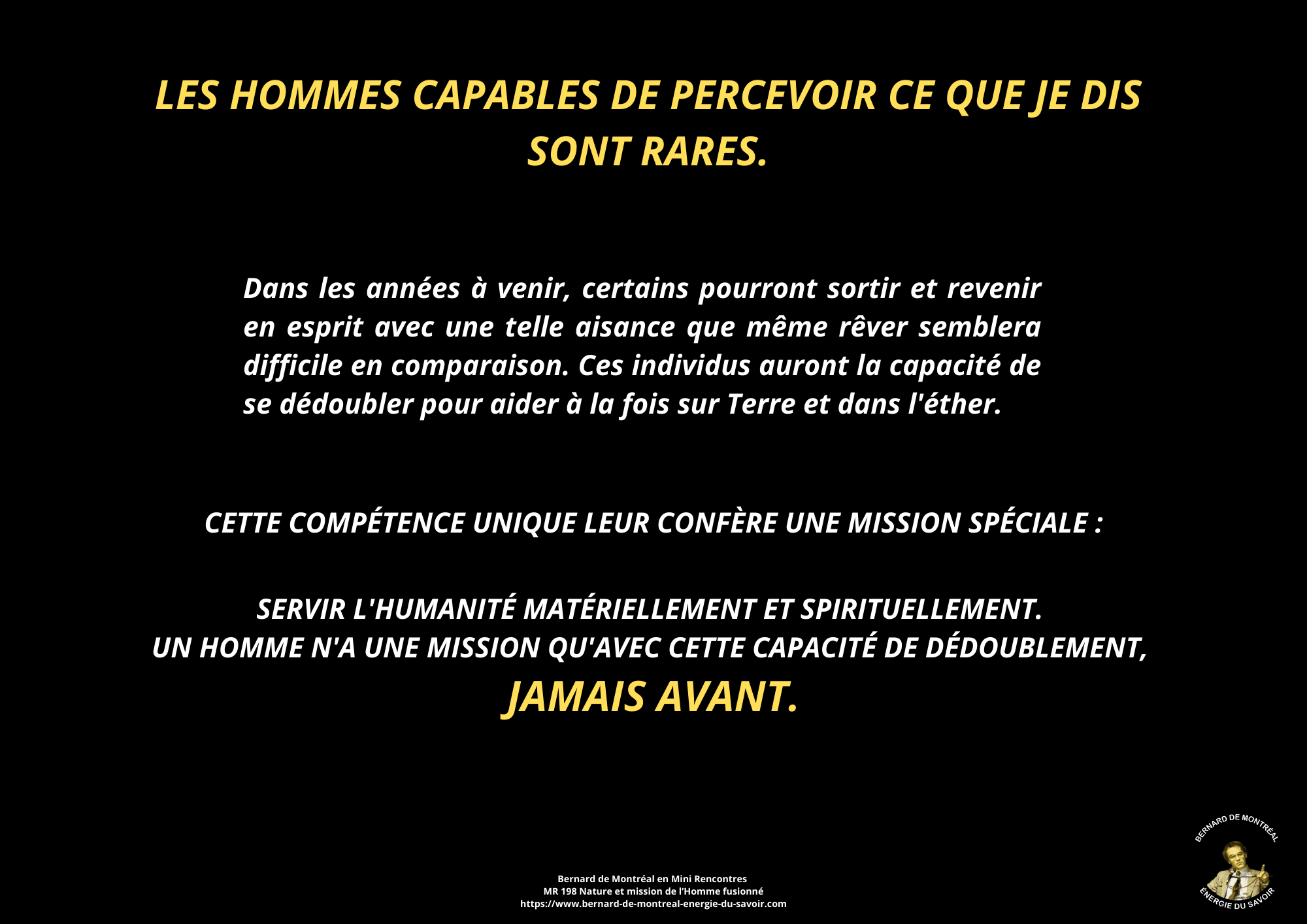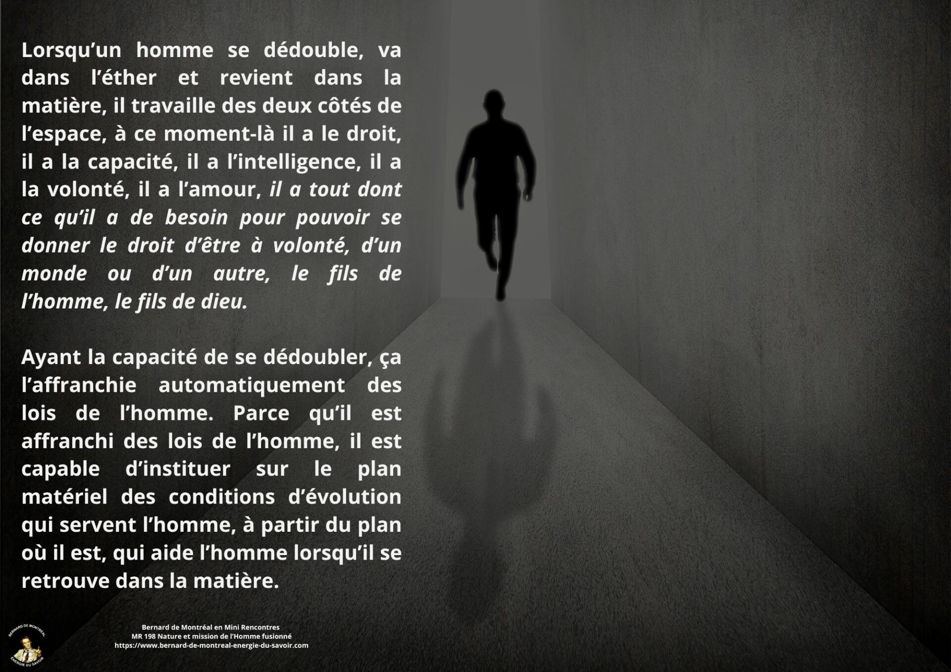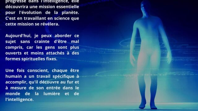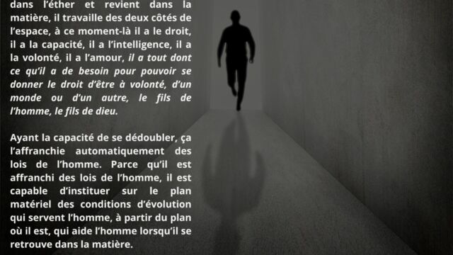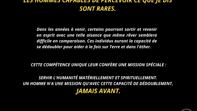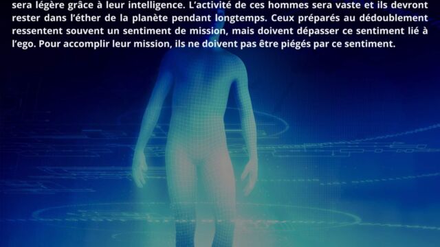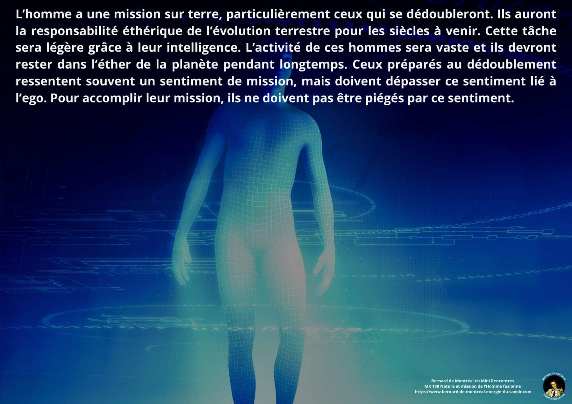 L’homme qui accède à l’éther par le dédoublement acquiert la connaissance de sa véritable identité. Cette connaissance le rend apte à remplir une mission précise dans l’évolution de la Terre. Cette mission ne peut être assumée que par ceux qui ont la capacité de se maintenir consciemment dans ce registre.