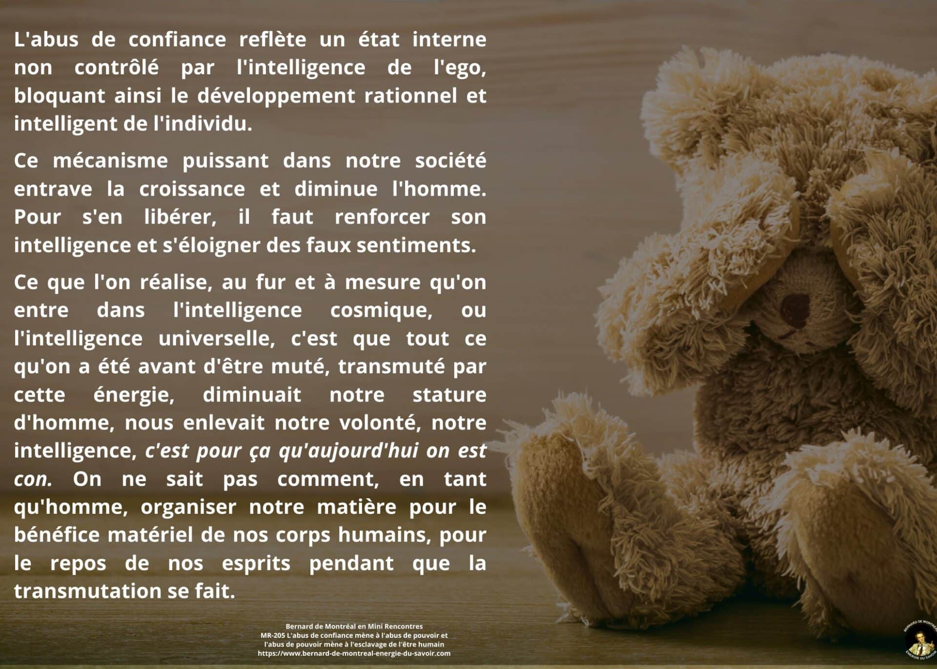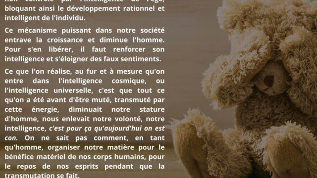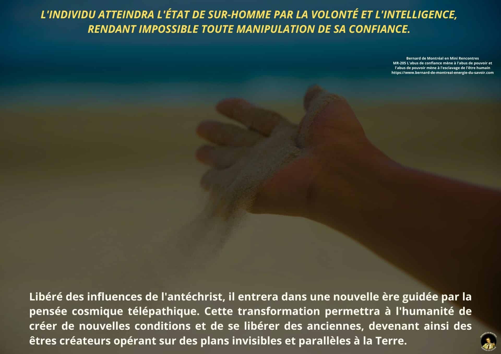 Il est exposé que lorsque la confiance est accordée sans discernement, elle ouvre la voie à une prise de pouvoir fondée sur la dépendance, entraînant à terme la perte d’autonomie et la destruction de l’individualité. Pour se soustraire à ces mécanismes, il est montré que le développement d’une intelligence vibratoire constitue un facteur déterminant, car elle permet de fonctionner au-delà des sentiments, des émotions et des réactions de l’ego.