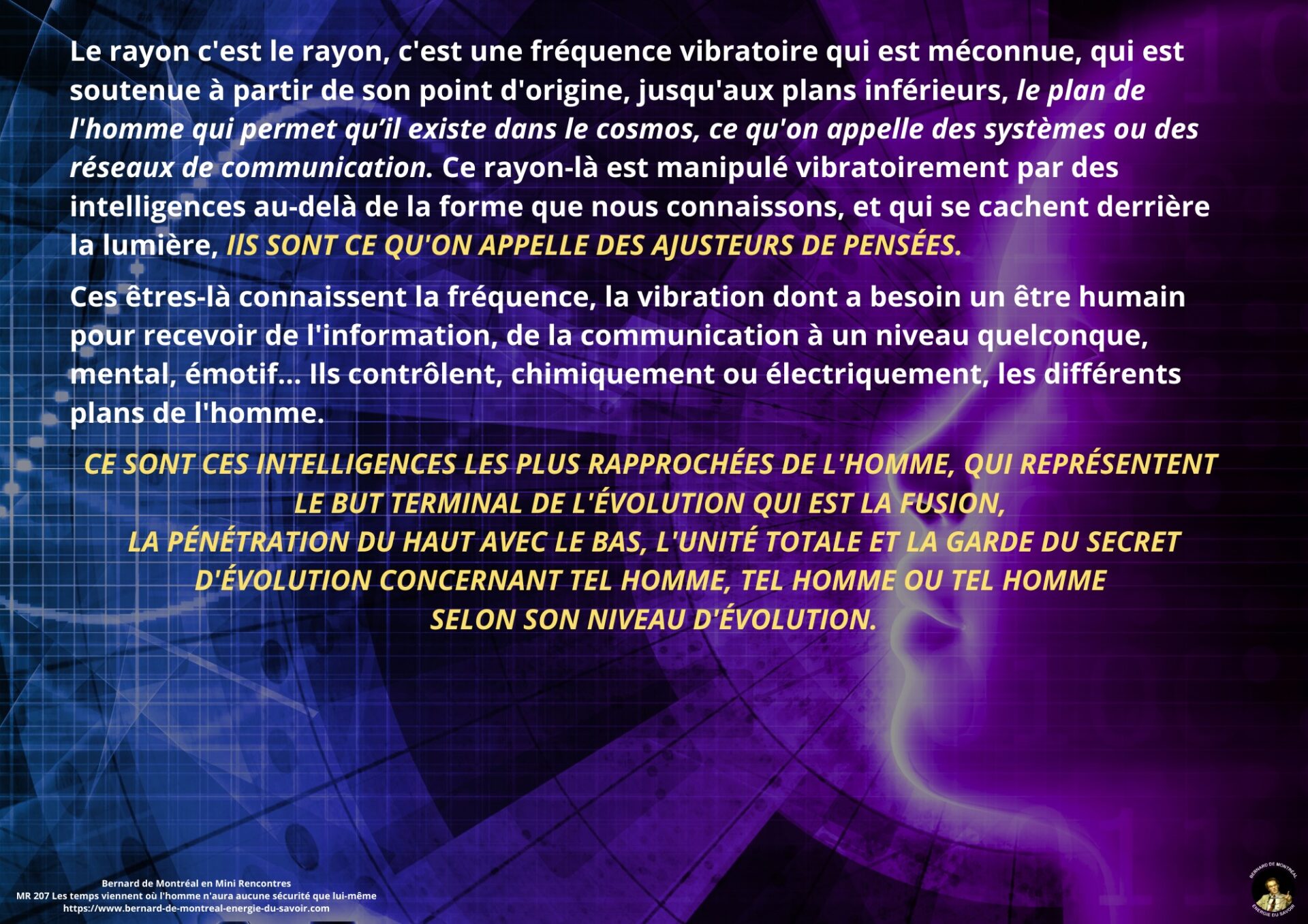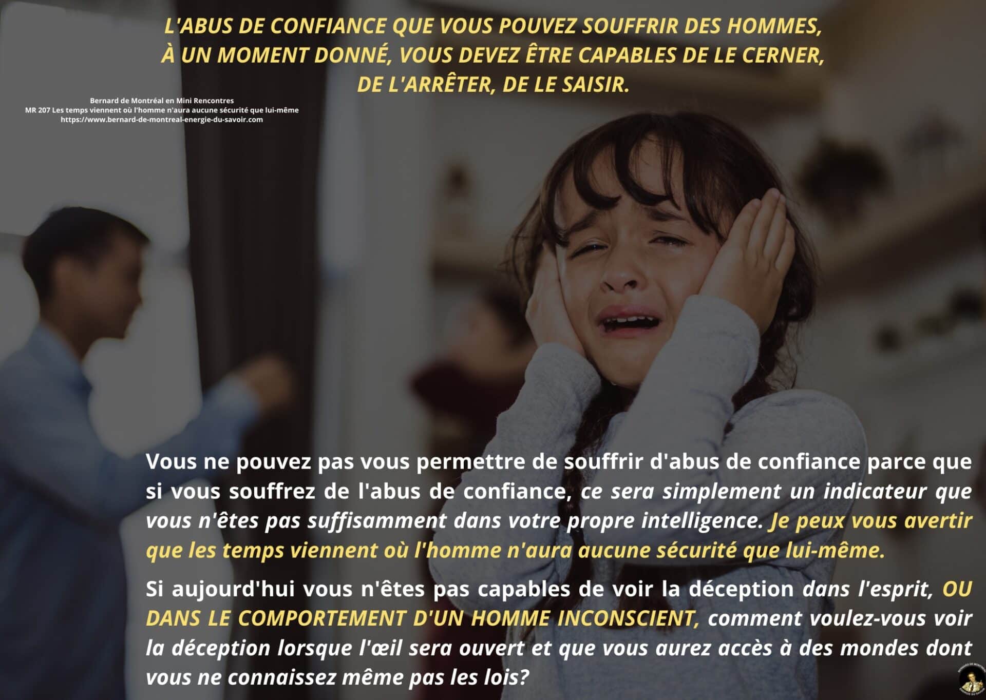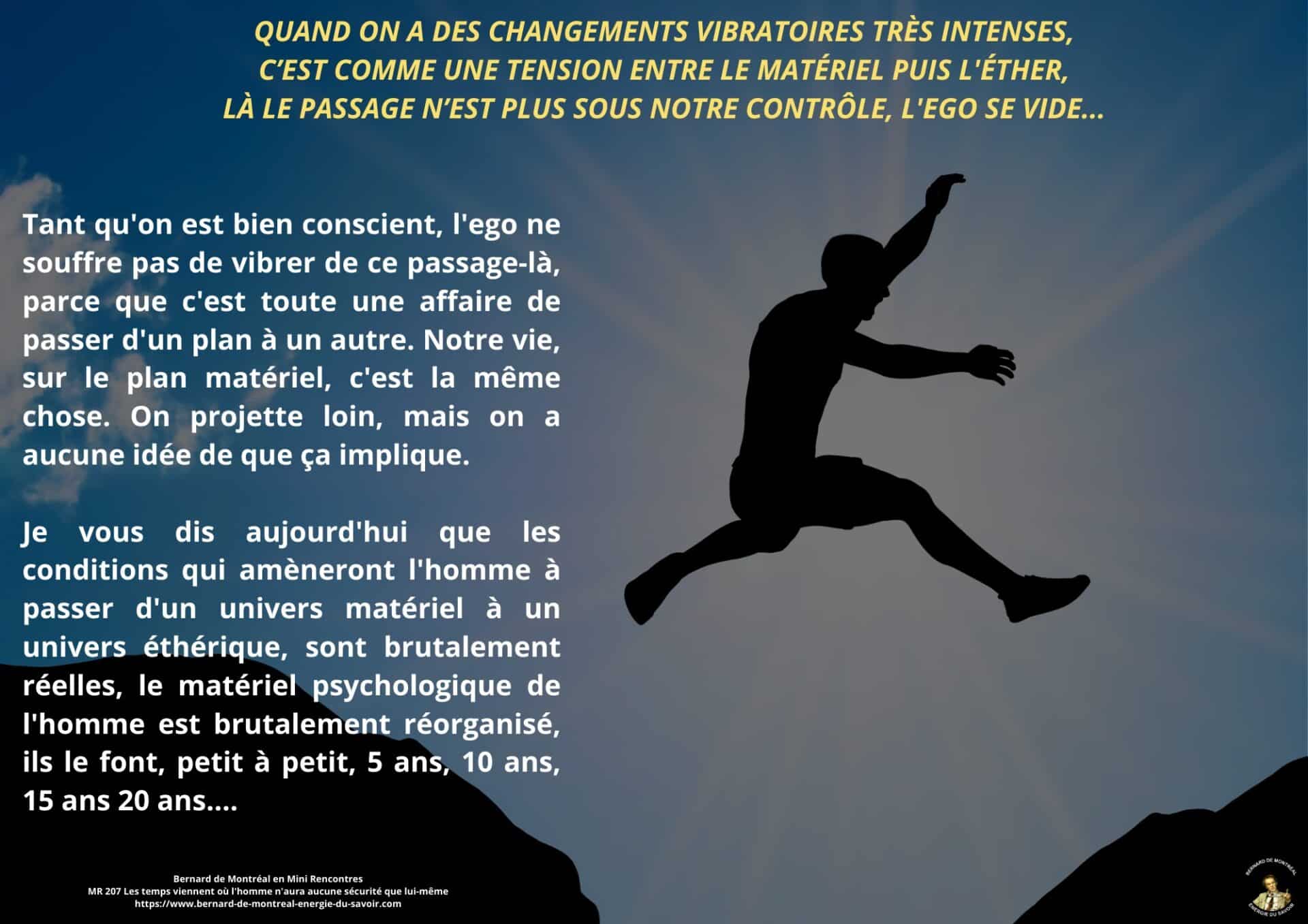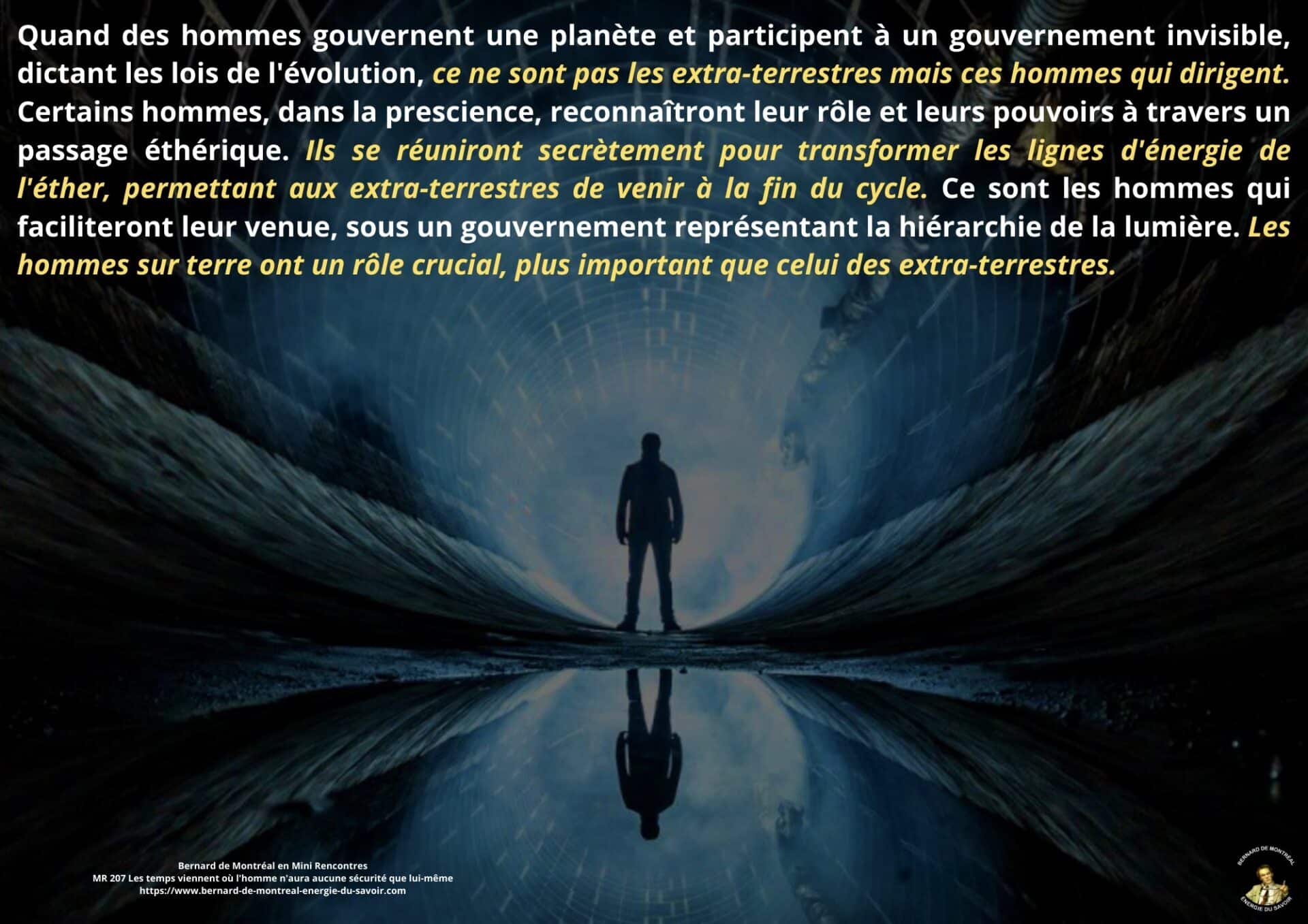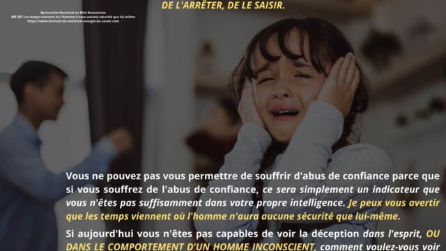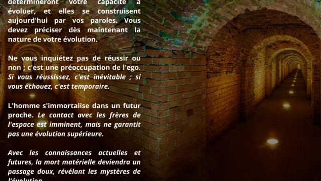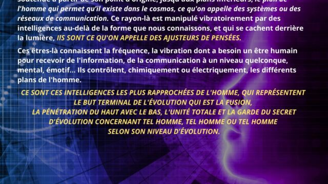 Le texte met en évidence la nécessité de ne pas se laisser piéger par la confiance aveugle accordée aux autres, et souligne l’importance de développer sa propre intelligence afin d’éviter toute forme de déracinement intérieur. Il apparaît que, dans les temps à venir, l’homme ne pourra compter que sur lui-même comme point de stabilité, à condition de ne pas se laisser happer par des projections anxiogènes liées à l’avenir ou à des scénarios occultes.