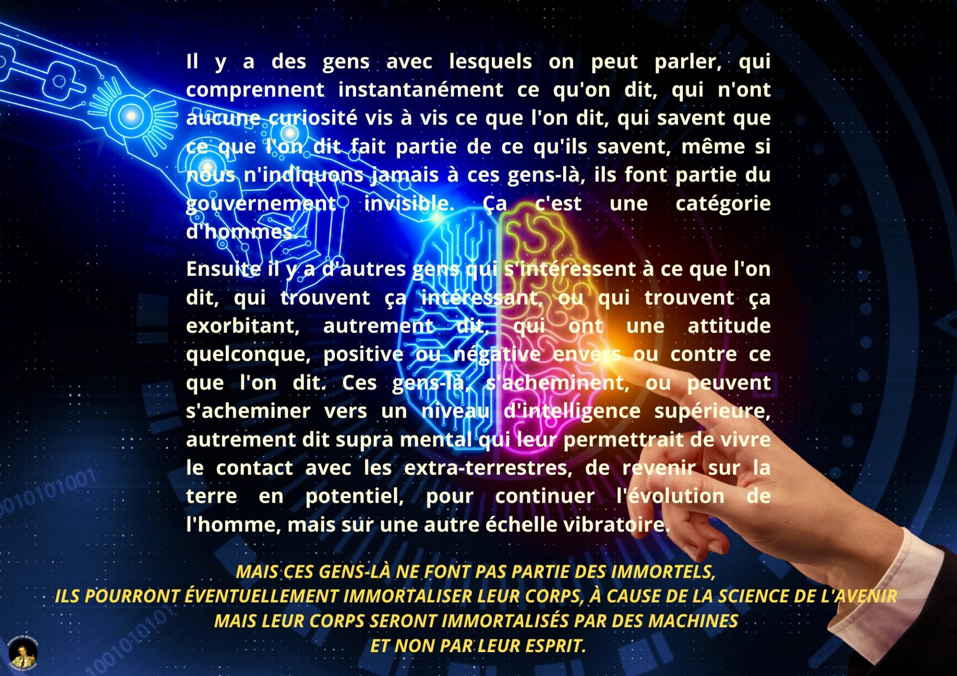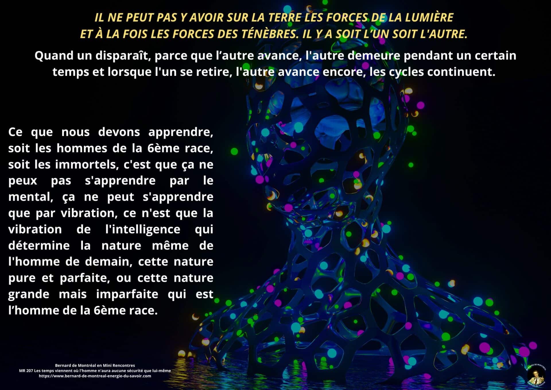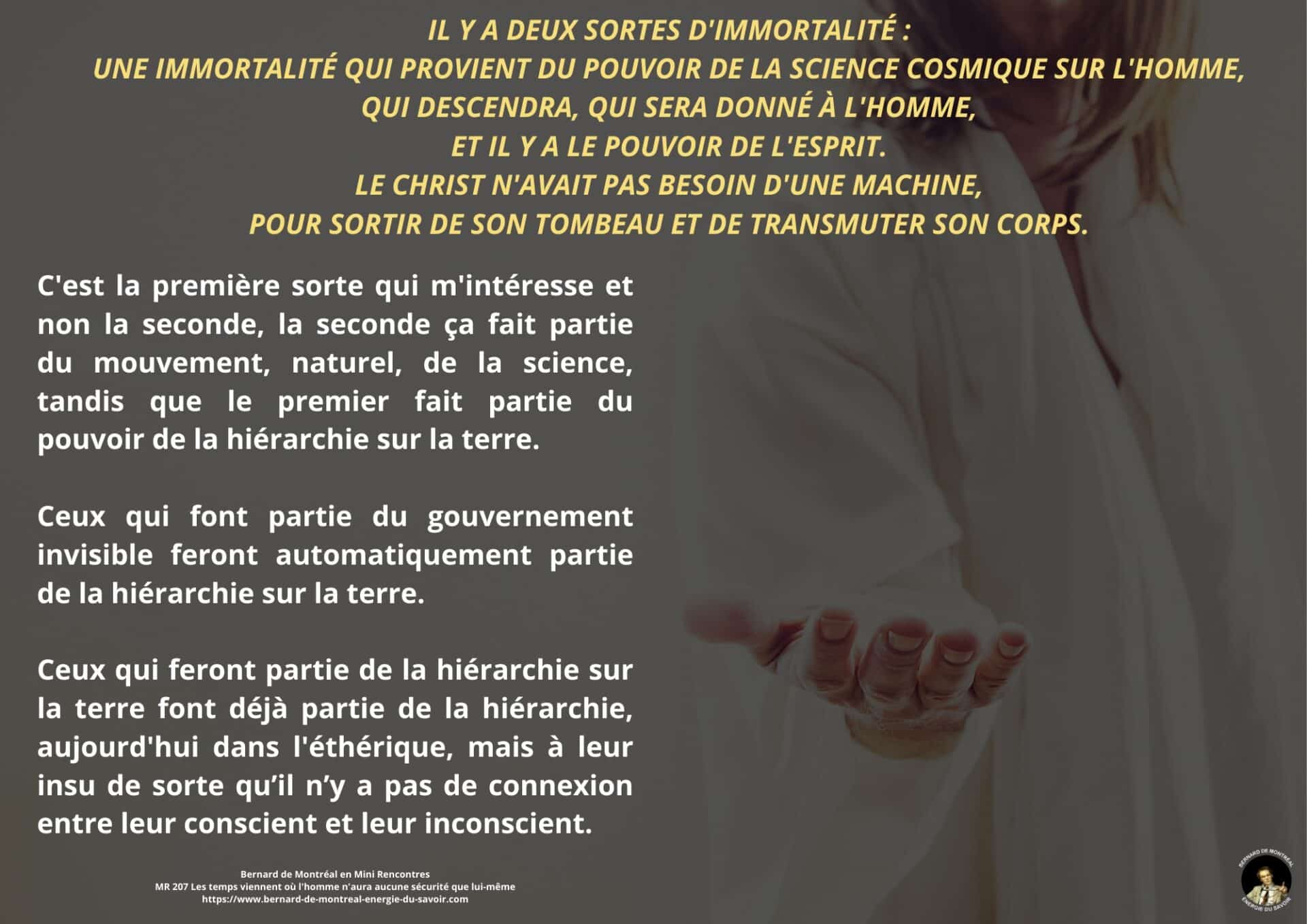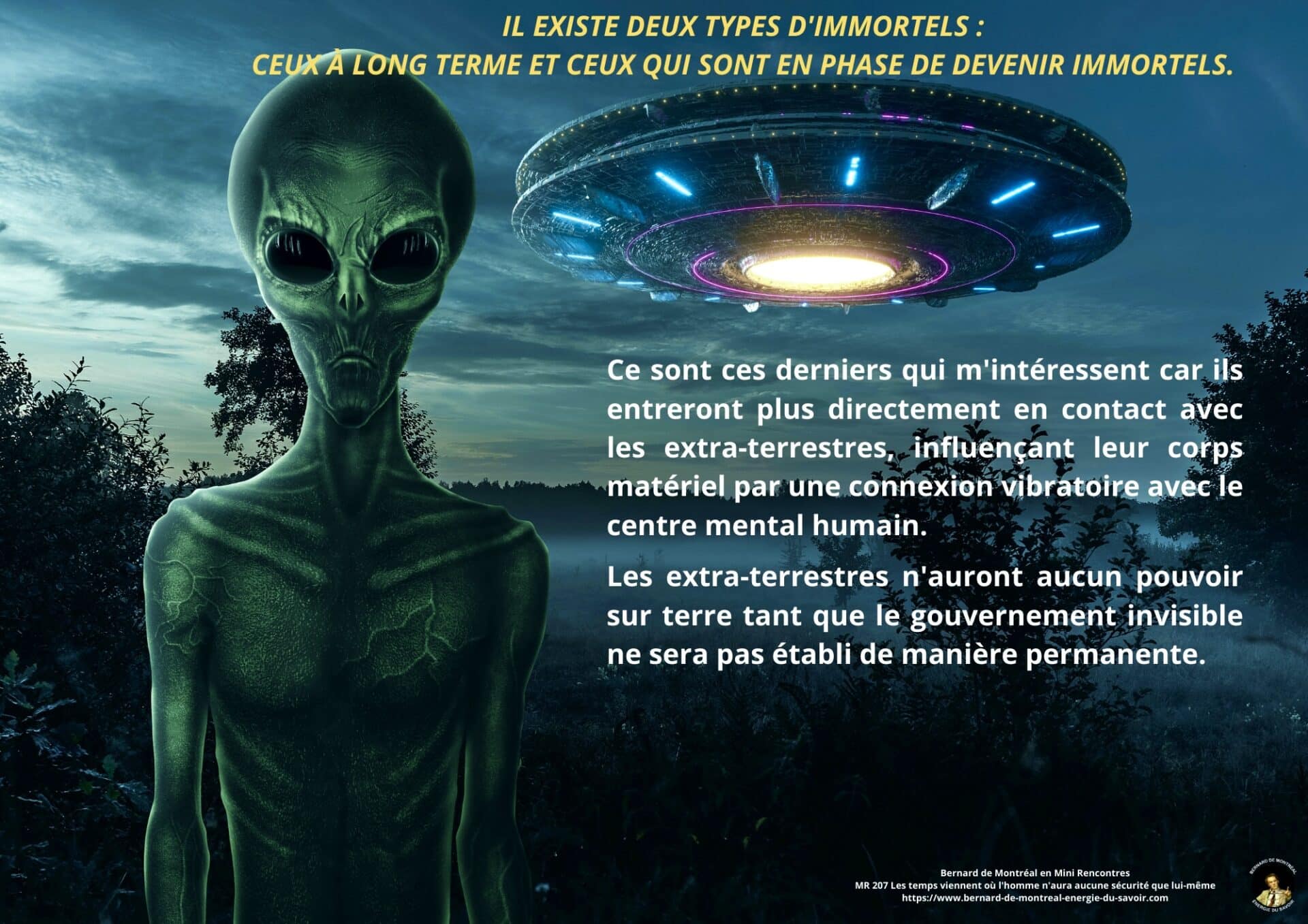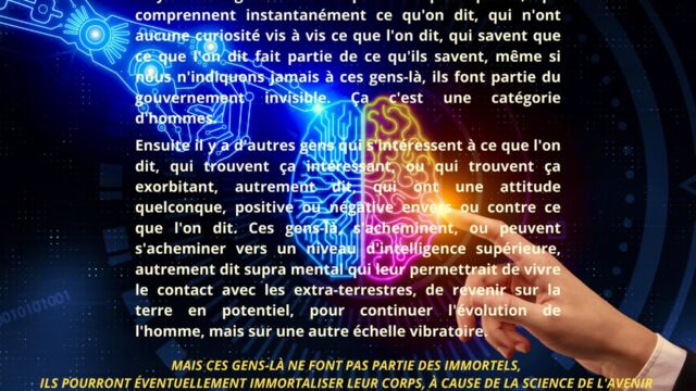 Les thèmes liés aux intelligences non humaines, aux immortels et aux structures invisibles sont abordés de manière factuelle, en montrant que toute intervention extérieure demeure soumise à des lois de régence précises et ne conditionne pas l’homme centré dans son intelligence. Une distinction est également opérée entre les états d’immortalité à long terme et les processus actuels de générance d’immortalité, ces derniers échappant aux conditionnements externes.