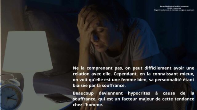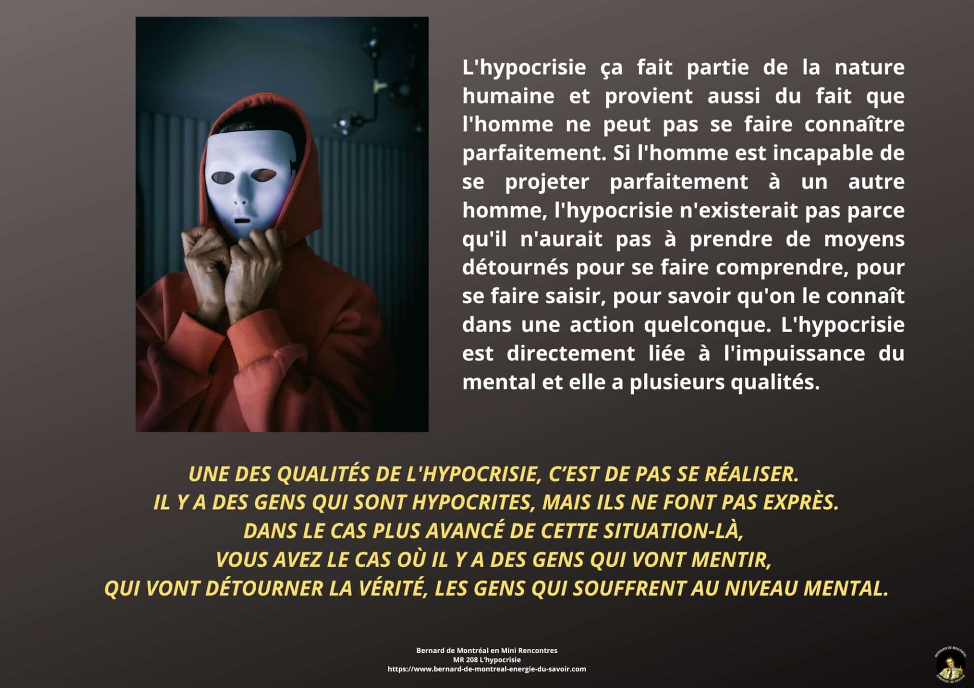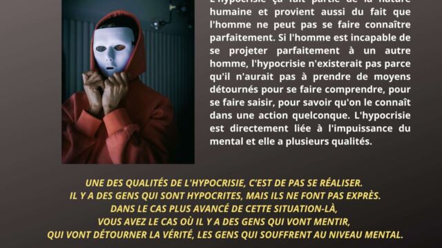Il est exposé que l’hypocrisie prend racine dans l’incapacité de l’être à se connaître et à se manifester avec justesse, le conduisant à recourir à des stratégies détournées pour se faire comprendre ou reconnaître.