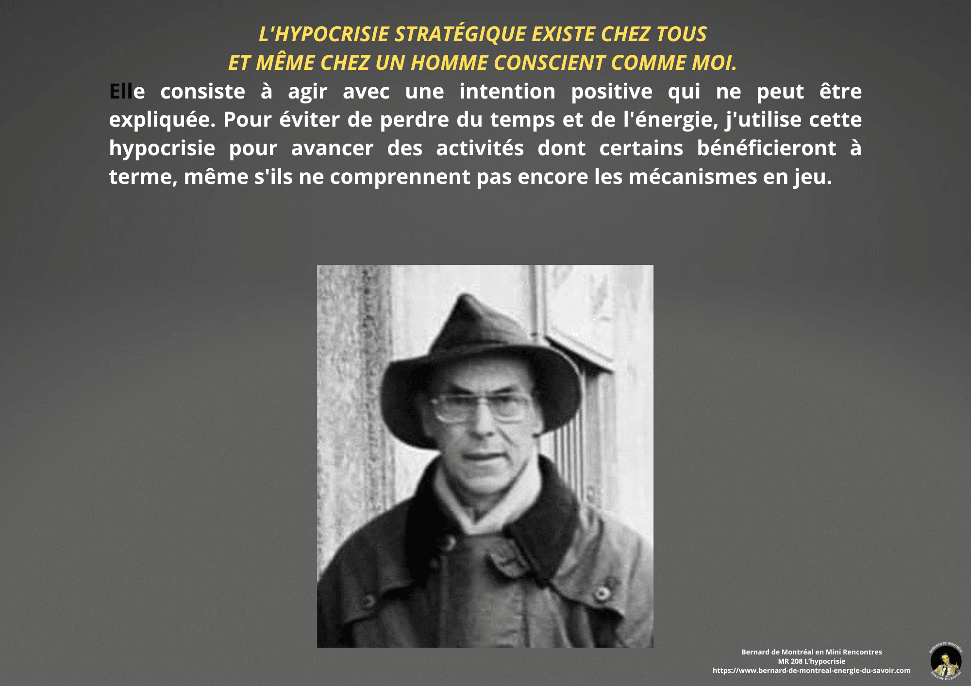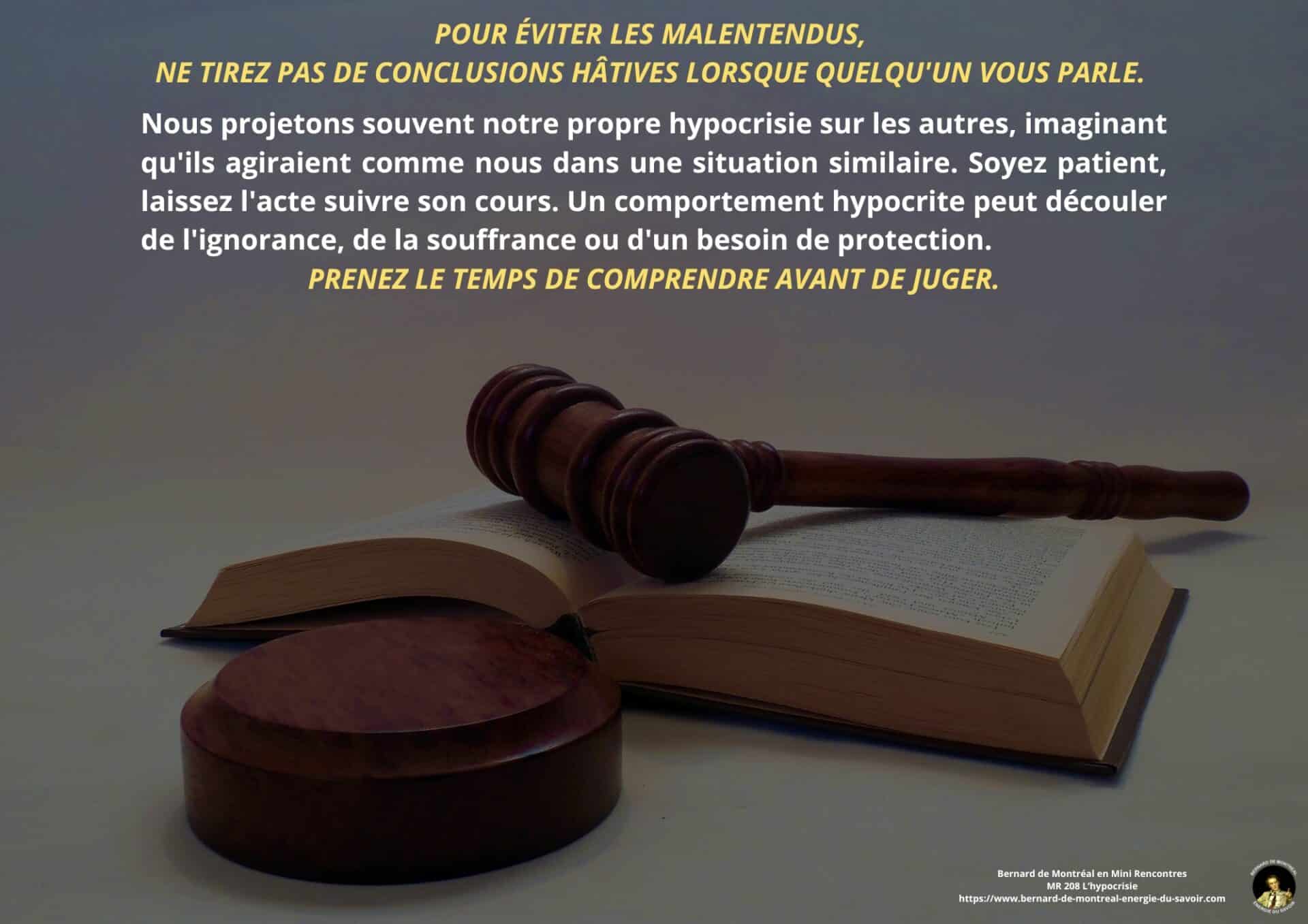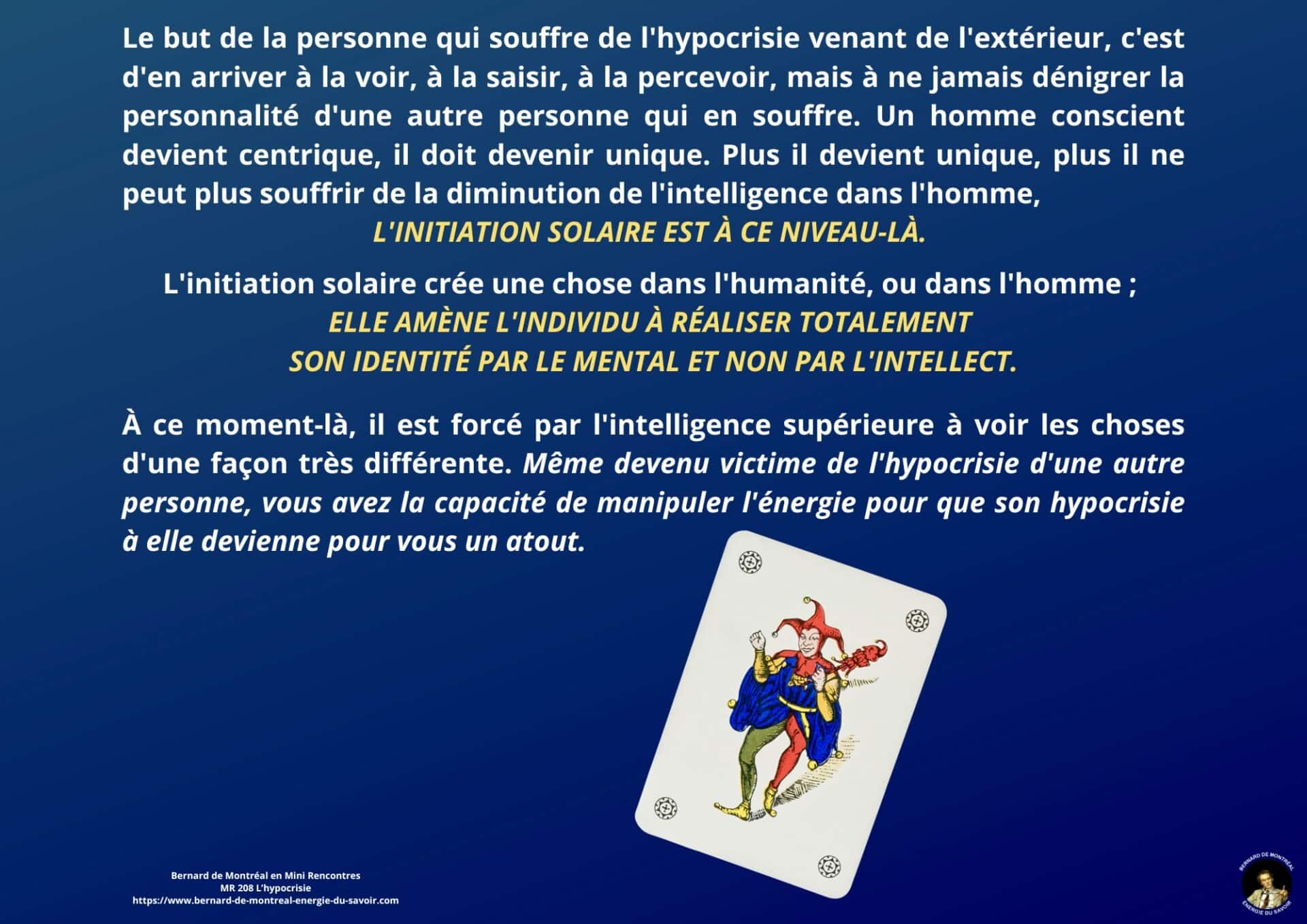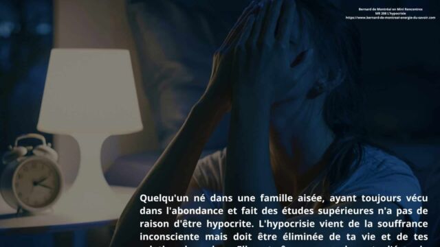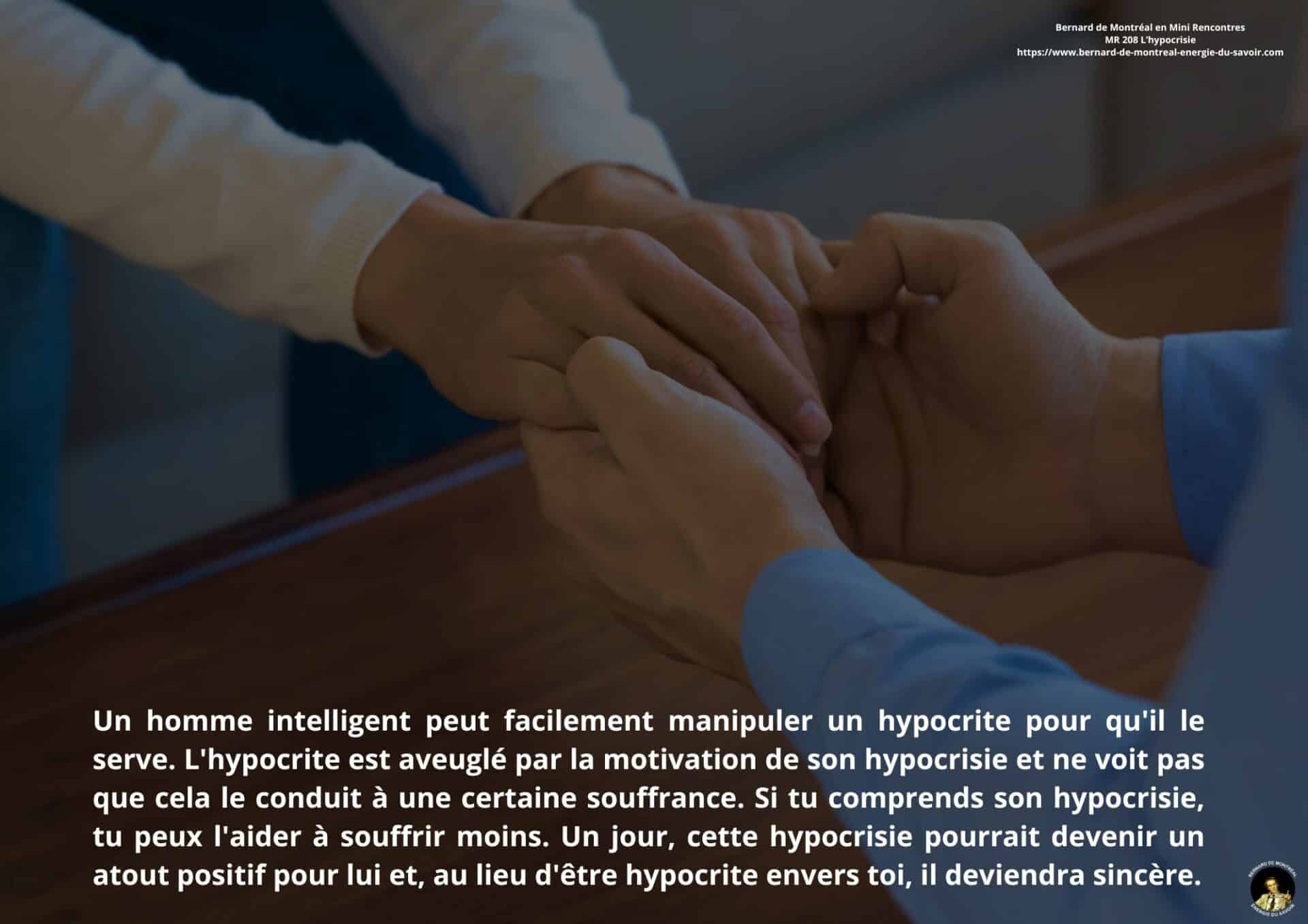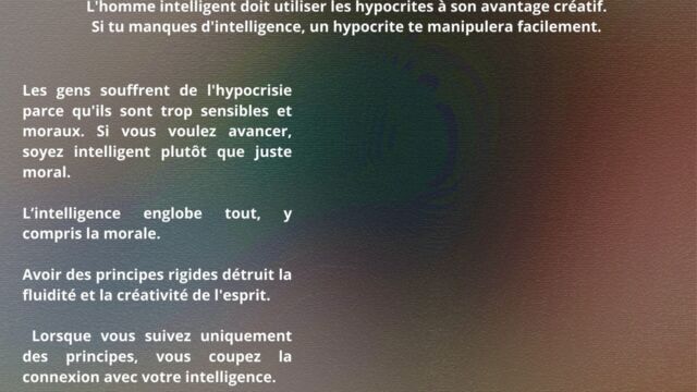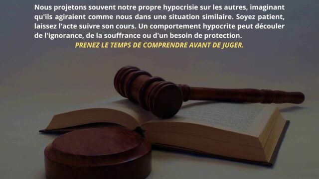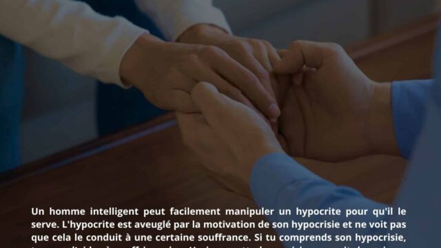 Il est suggéré de ne pas souffrir de l’hypocrisie d’autrui, mais de l’observer sans la dénoncer, en maintenant une centricité mentale qui préserve l’équilibre intérieur. Le texte indique également que l’hypocrisie peut constituer un mécanisme de protection chez des êtres ayant été blessés, et que l’intelligence permet d’en transformer la charge en levier d’ajustement.