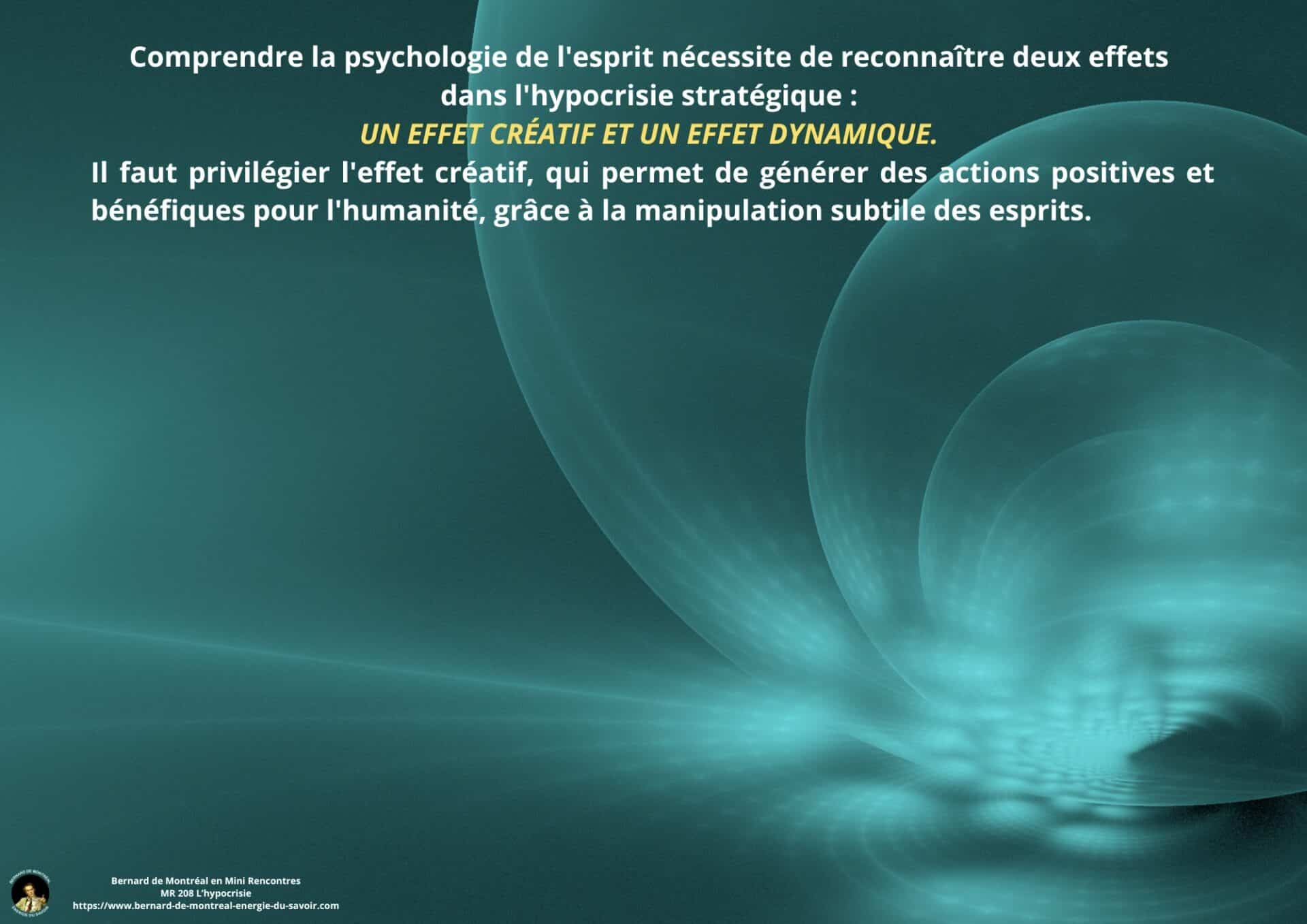 Le texte met en évidence que l’hypocrisie, lorsqu’elle s’installe durablement, engendre des déficiences psychologiques et altère profondément la qualité des relations humaines. Une distinction est opérée entre une hypocrisie dite stratégique, pouvant être utilisée de manière ponctuelle et créative dans certains contextes fonctionnels, et une hypocrisie dynamique, plus insidieuse, qui fragmente l’être et désorganise ses rapports au monde.