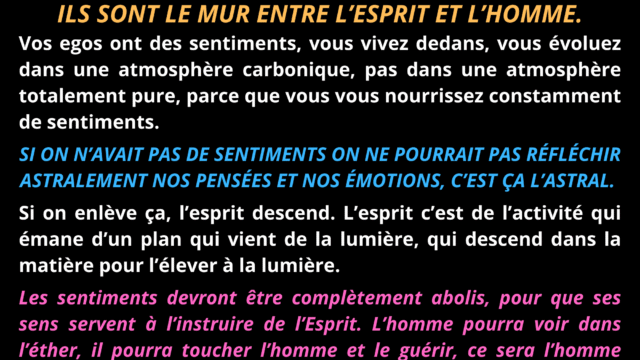 Il est exposé que les sentiments, issus de la dynamique astrale, empêchent la descente pleine et effective de l’Esprit dans la matière en maintenant l’ego dans une conscience fragmentée et réactive. L’évolution humaine est présentée comme un processus de dépassement de cette condition, visant à dissoudre progressivement l’emprise des sentiments afin de permettre à l’Esprit de s’incarner sans distorsion.
