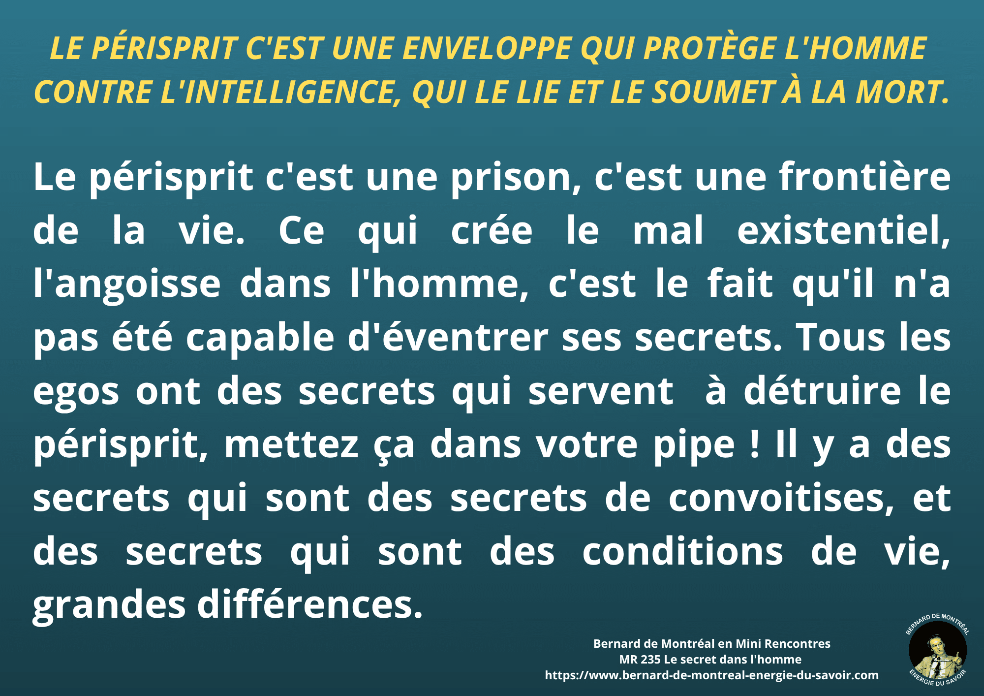 La synthèse introduit alors le rôle fondamental des secrets intérieurs, propres à chaque individu, présentés comme des clés opératives permettant de fragiliser et de dissoudre progressivement le périsprit. Ces secrets ne relèvent pas de la dissimulation sociale, mais d’un savoir vécu, intégré et protégé, qui soutient la maturation intérieure et l’accès à une intelligence supérieure. Lorsqu’ils sont compris et utilisés avec justesse, ils permettent à l’homme de transcender les limitations imposées par le périsprit et d’entrer dans une dynamique de vie plus cohérente et harmonieuse.