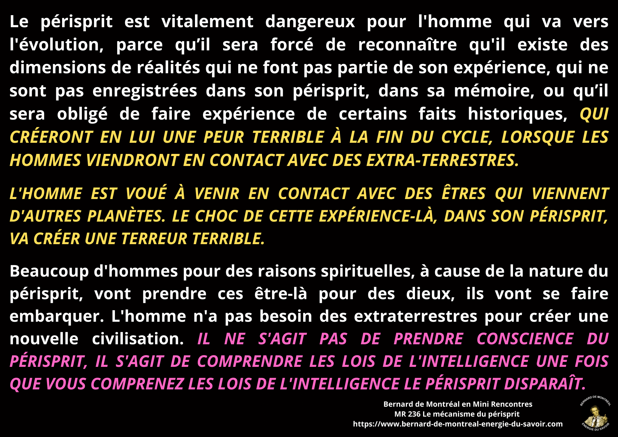 Il est exposé que le périsprit agit comme un filtre constant à travers lequel se forment les pensées, les émotions et les réactions, maintenant l’être dans une lecture restreinte de la réalité. Tant que cette structure demeure dominante, l’homme fonctionne à partir de ses insécurités, de ses manques et de ses désirs conditionnés, sans accès direct à une intelligence plus vaste. La libération progressive de l’influence du périsprit apparaît alors comme une condition essentielle pour l’évolution vers une conscience supérieure. Ce détachement permet à l’homme de vivre non plus selon les impulsions dictées par la peur ou le besoin, mais en accord avec l’intention de l’intelligence cosmique et le mouvement de l’énergie universelle.