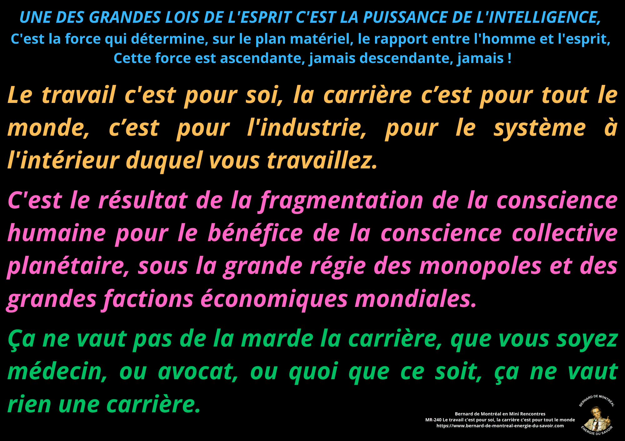 BDM souligne que la carrière relève essentiellement d’une construction sociale, destinée à répondre aux attentes collectives et aux impératifs du système économique, au prix d’une aliénation progressive de l’individu. À l’inverse, le travail est présenté comme une activité intrinsèquement personnelle, reliée à l’expression de l’esprit et à la structuration d’une vie cohérente avec son mouvement intérieur.
