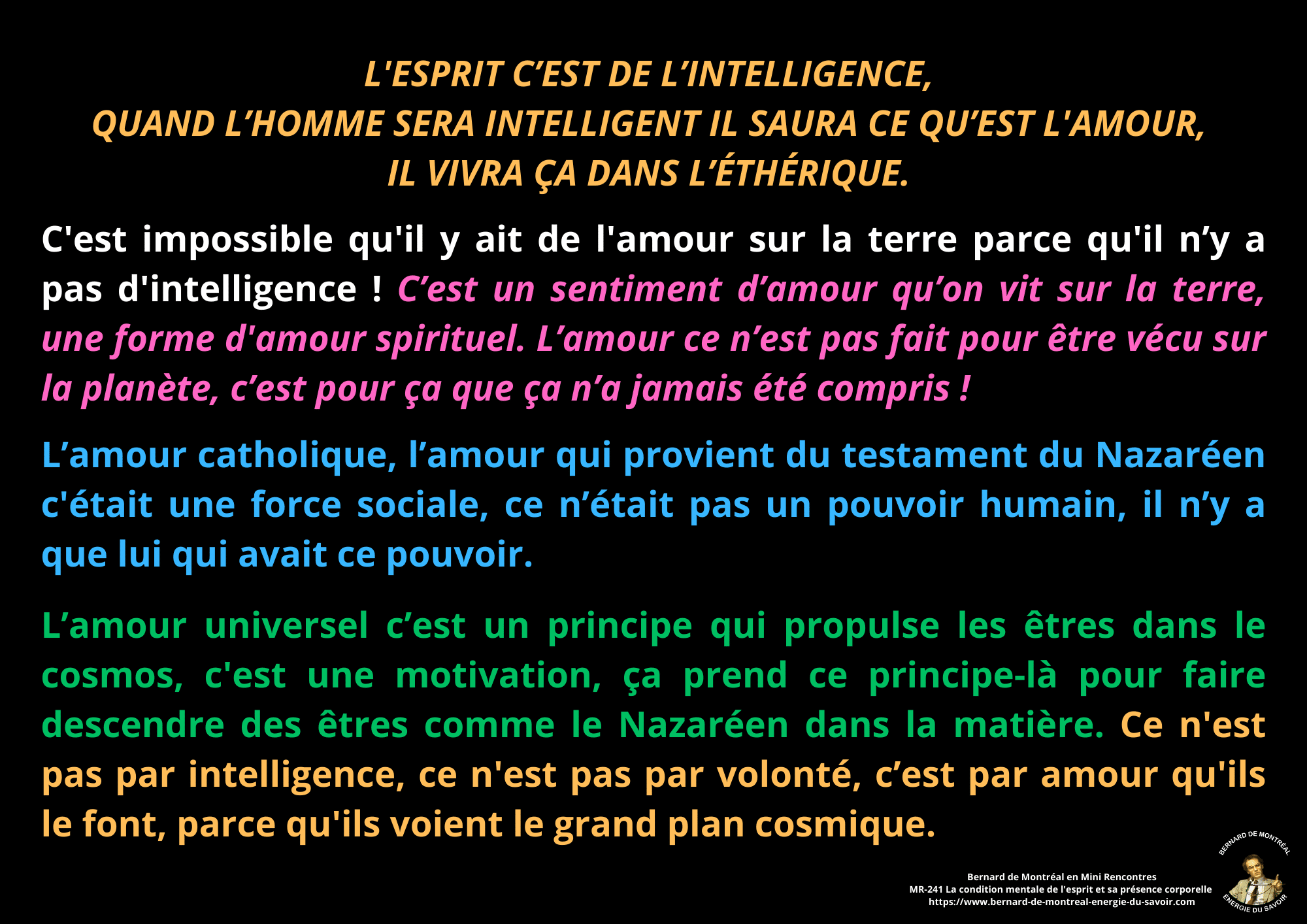 La synthèse critique par ailleurs les dérives d’une spiritualisation excessive qui éloigne l’homme de cette réalité incarnée, et précise que l’amour véritable relève d’un pouvoir créatif souvent mal interprété dans l’expérience humaine. Il est enfin mis en évidence que vivre dans l’intelligence de l’esprit constitue la condition d’une vie plus pleine, stable et harmonieuse, affranchie des peurs et des projections psychologiques.