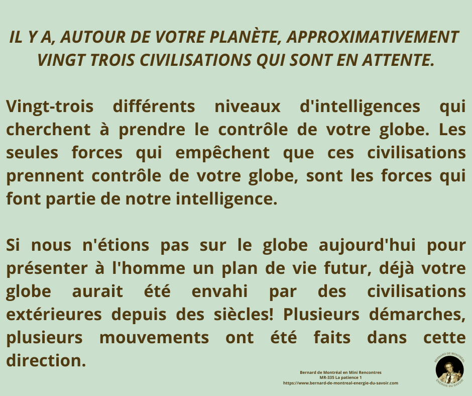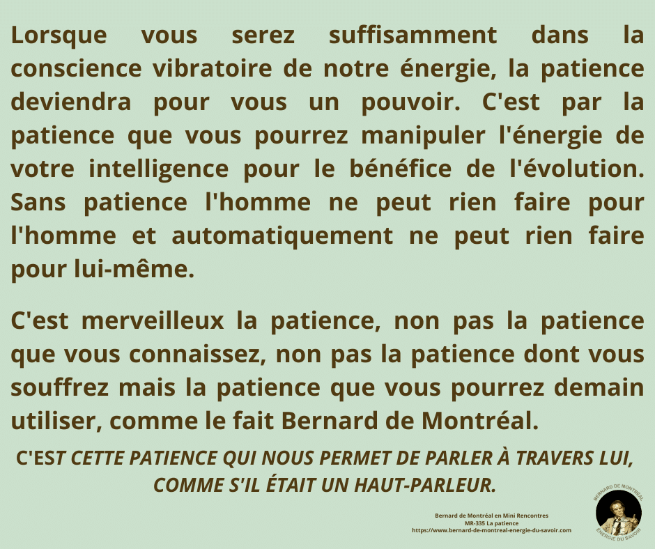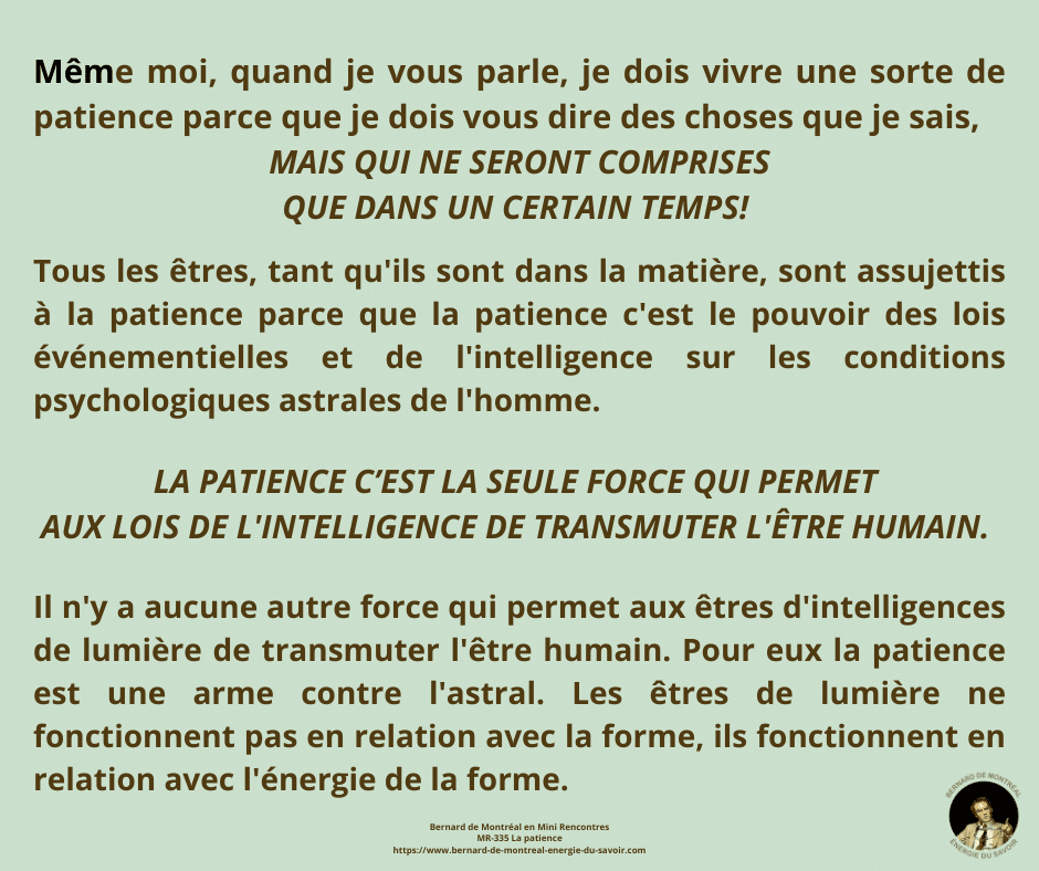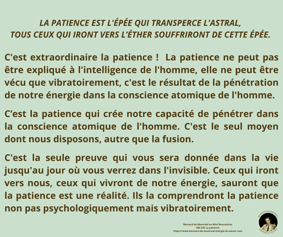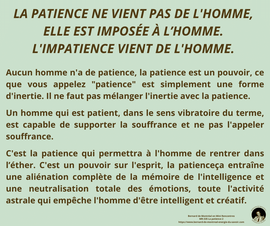 La patience n’est pas une vertu morale mais une énergie supramentale imposée à l’homme pour transmuter son être. Selon Bernard de Montréal, elle découle de l’intelligence créative, seule capable de traverser l’échec sans s’y fixer et de soutenir une construction vibratoire juste, tant chez l’individu que dans l’entreprise. Cette énergie agit comme un pouvoir sur l’Esprit : elle permet de supporter la pression sans la vivre comme souffrance et prépare l’entrée dans l’éther. La patience n’est donc pas innée ; elle est une force directive nécessaire à l’évolution consciente.