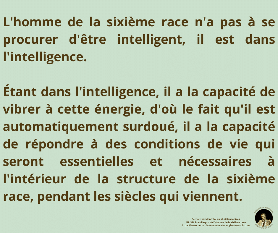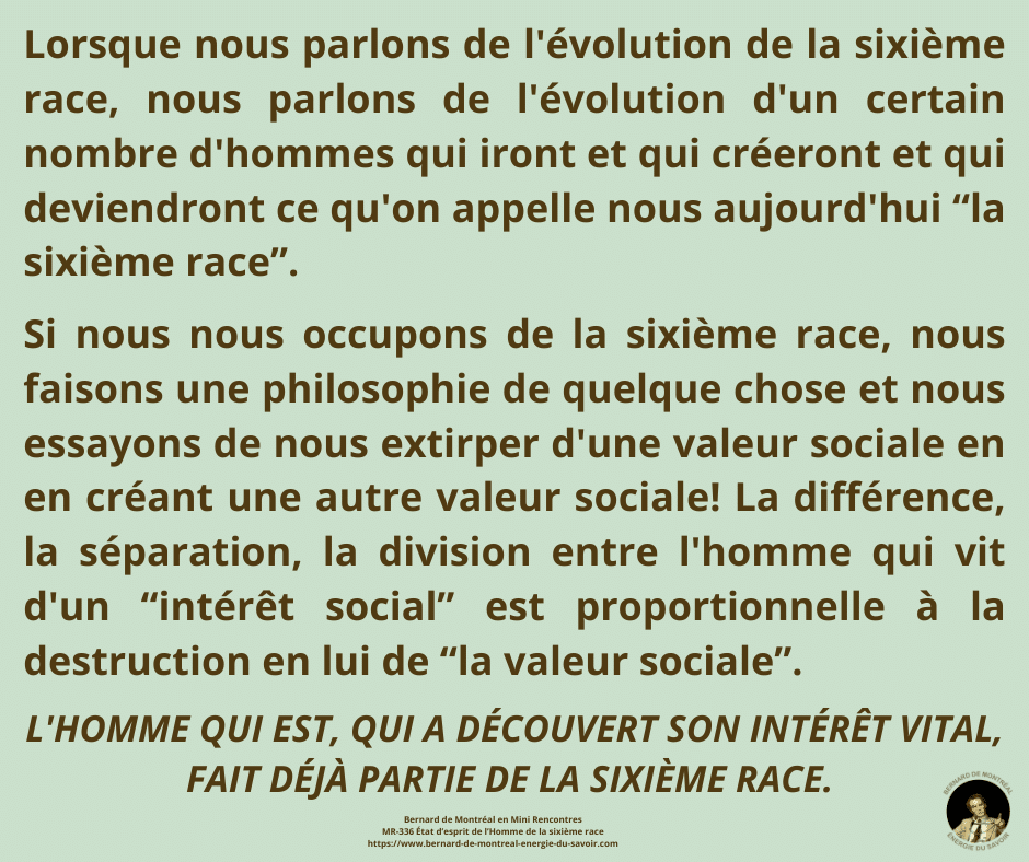 L’état d’esprit de l’homme de la sixième race se caractérise par un détachement progressif des valeurs psychologiques imposées par la collectivité et par un réalignement sur une conscience universelle animée par une intelligence créative autonome.